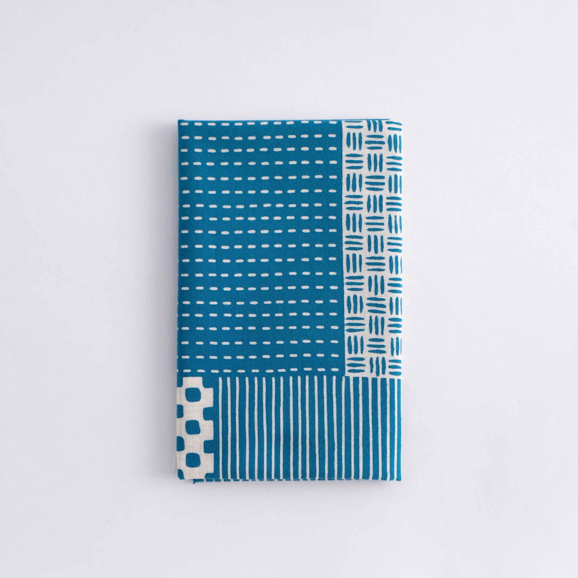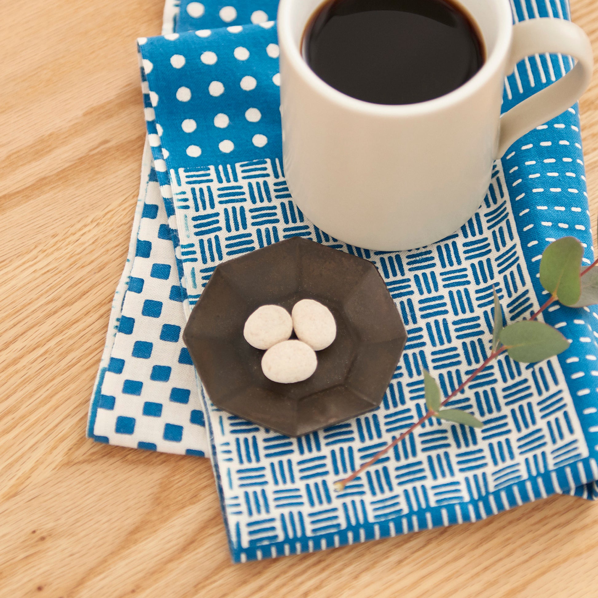 The "Kiri-Tsugi Komon" pattern features a design that randomly arranges various traditional Japanese patterns such as "Mame-Shibori" (bean dots), "Yoroke-Shima" (diagonal stripes), "Ajiro-Koushi" (lattice), and "Ichimatsu-Koushi" (checkerboard). The beauty of this design is that it offers different expressions depending on how it is folded. It also makes a great accent around the neck when used as a scarf. Wrapping a wine bottle with it will give you yet another unique look to enjoy.