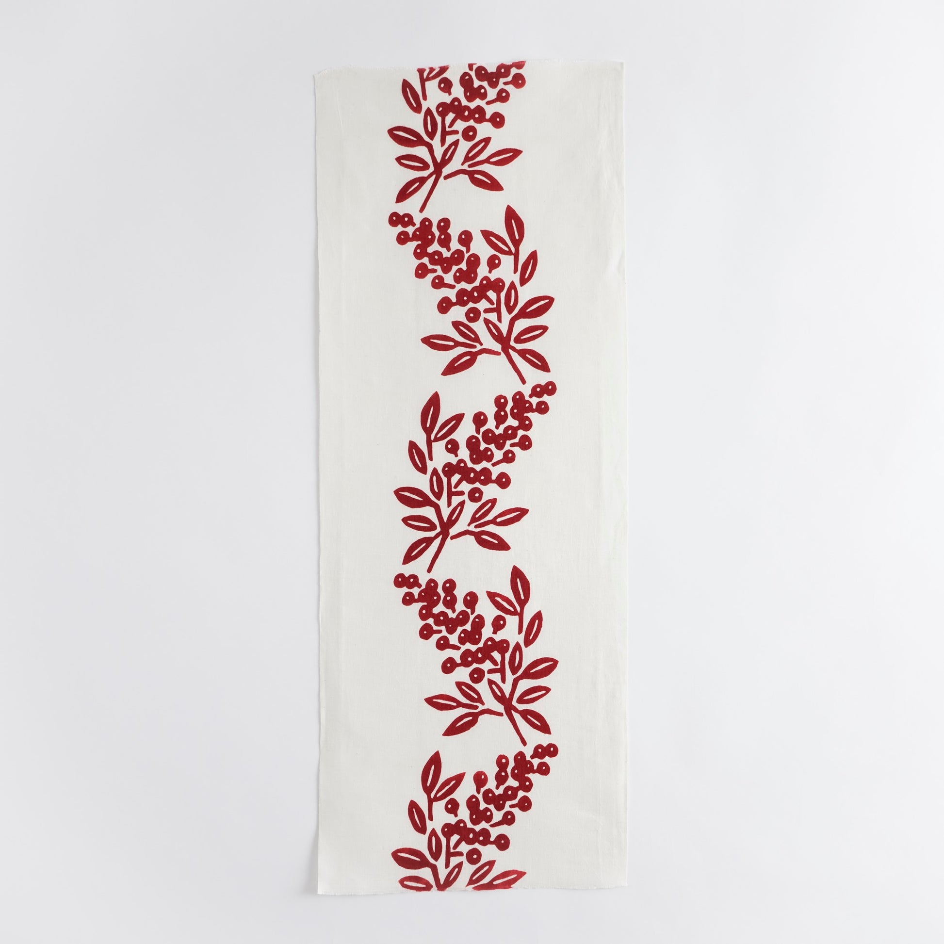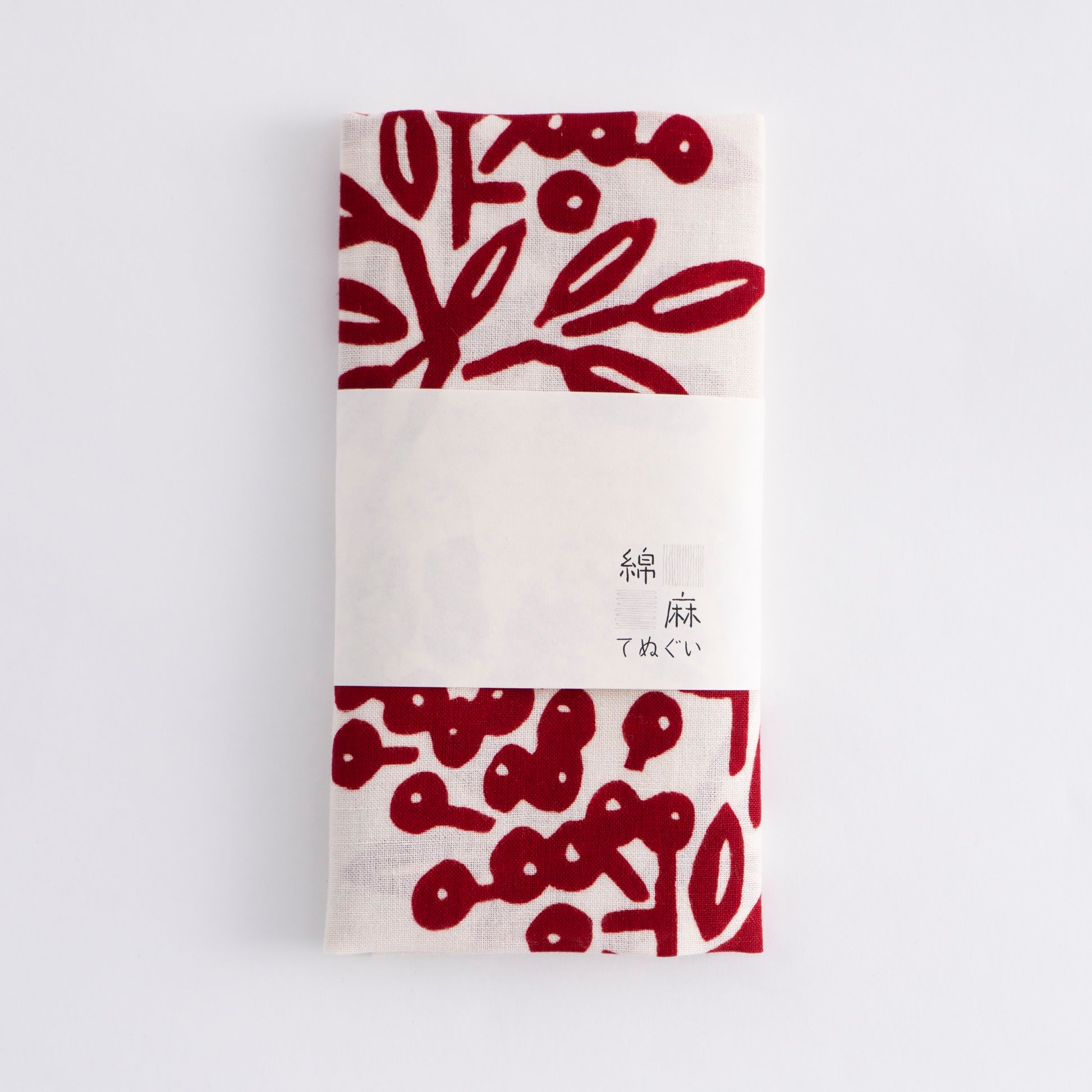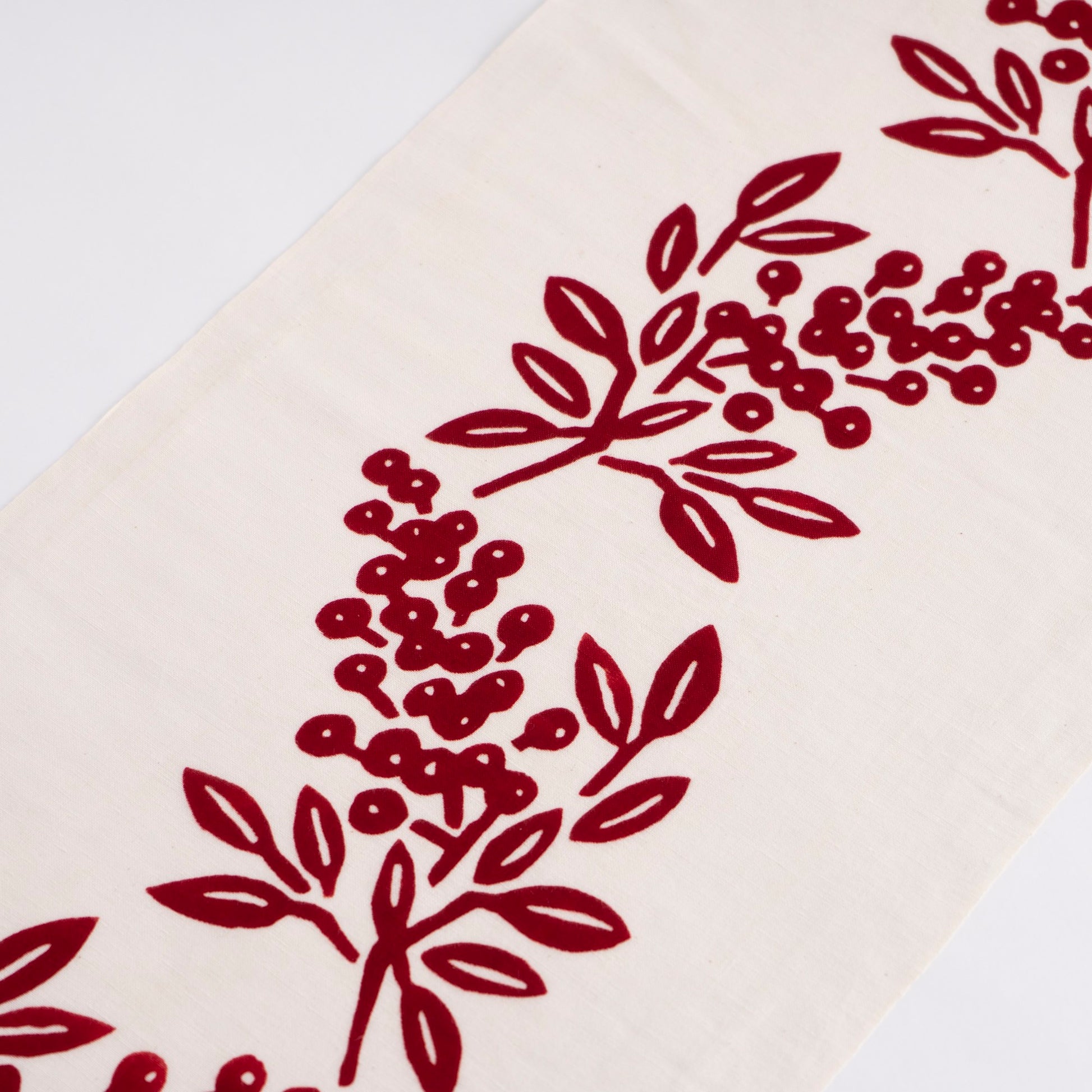 This tenugui towel is about 37cm x 100cm (14in x 39in) and made in Japan of cotton linen woven with cotton warp and linen weft. Cotton and linen tenugui towels are durable, absorbent, and easy to dry. They can be used as table runners, kitchen towels, and tea towels. It depicts "Nanten", a familiar motif and lucky charm in Japan.