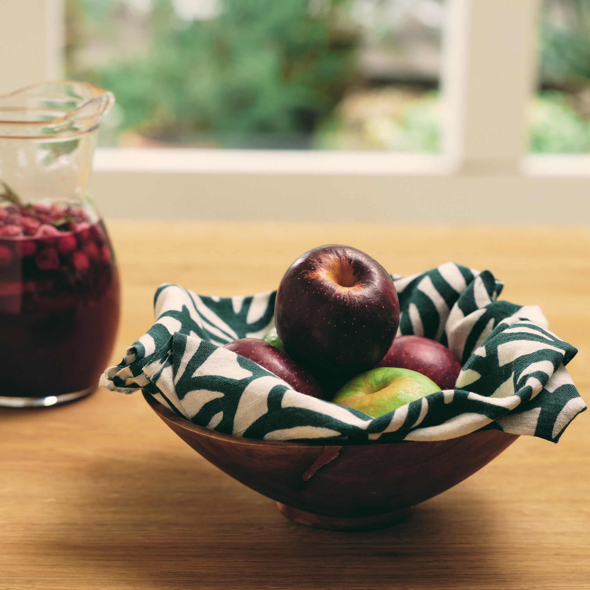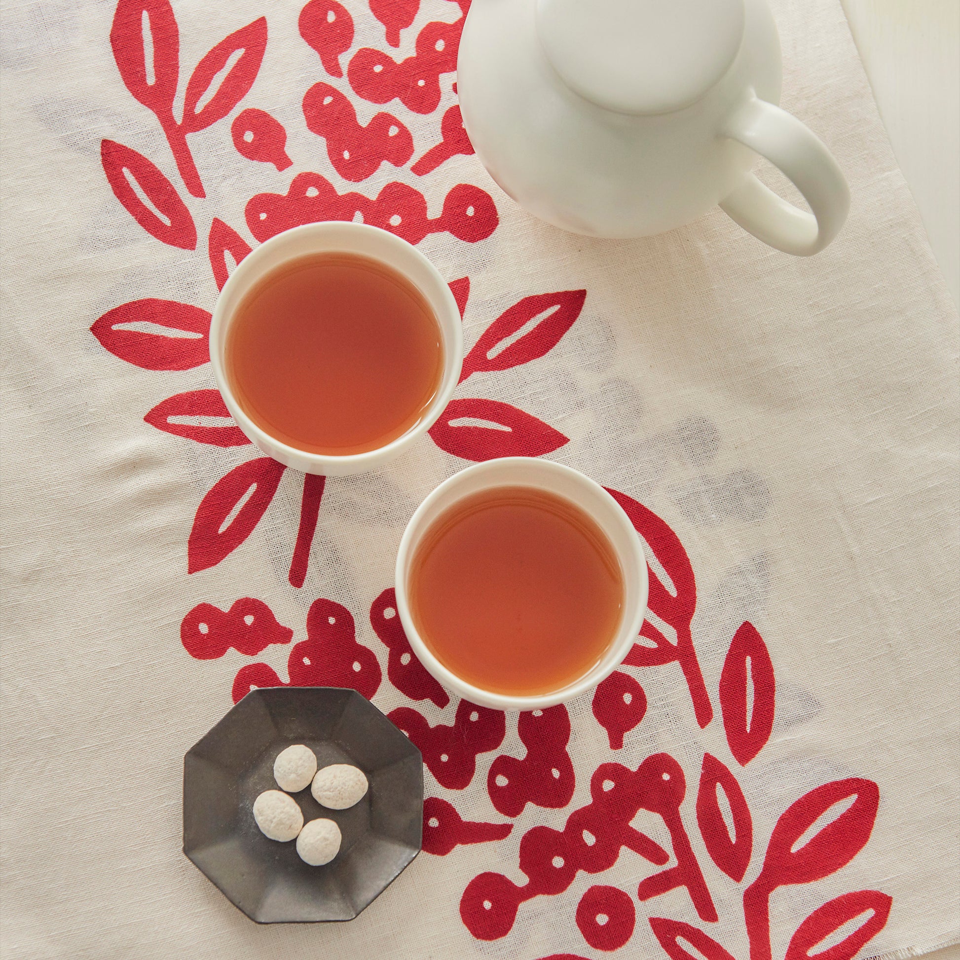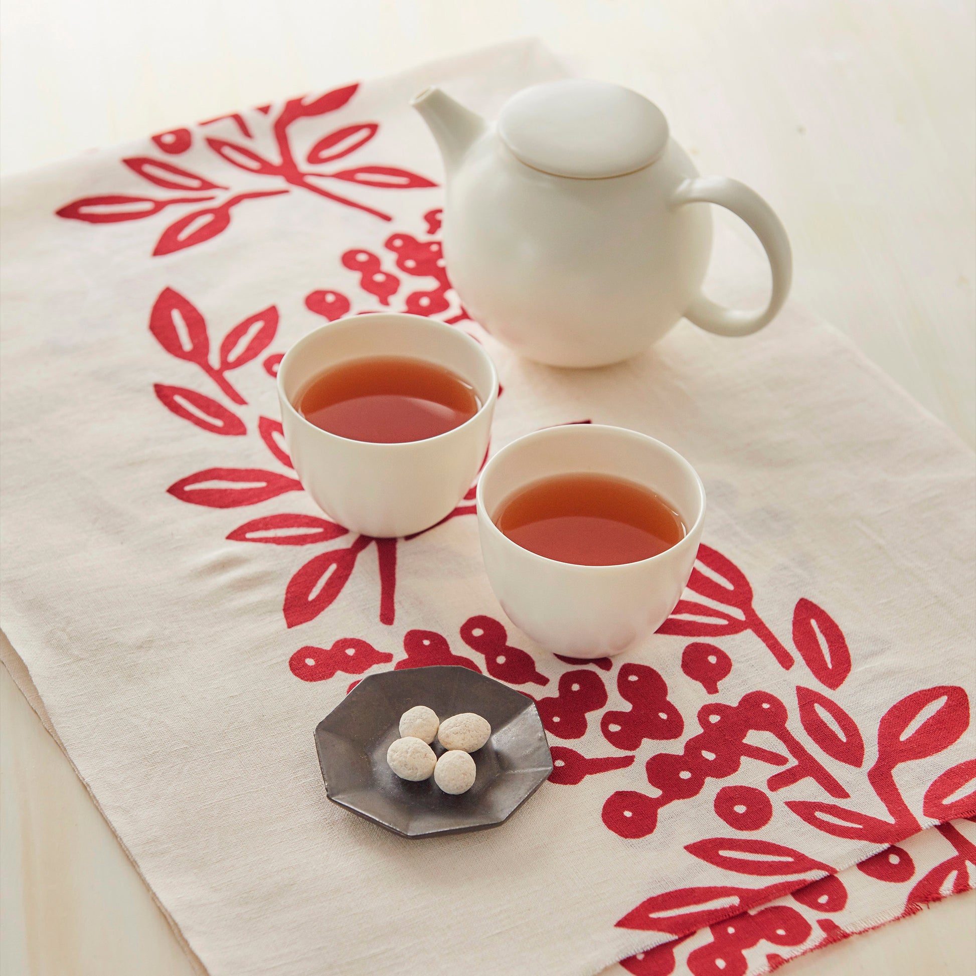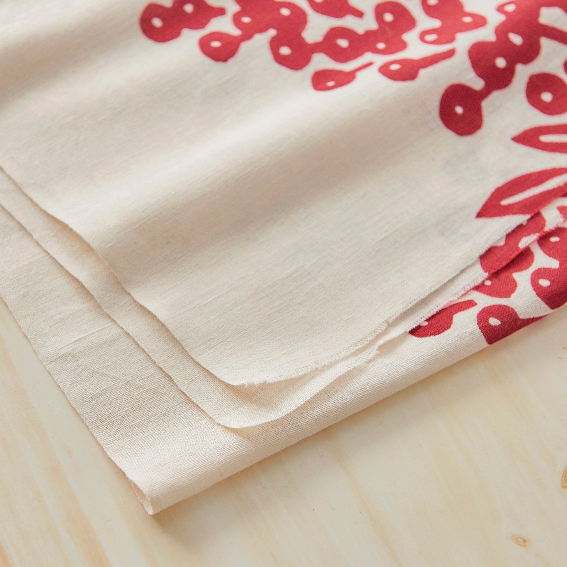 This tenugui towel is about 37cm x 100cm (14in x 39in) and made in Japan of cotton linen woven with cotton warp and linen weft. Cotton and linen tenugui towels are durable, absorbent, and easy to dry. They can be used as table runners, kitchen towels, and tea towels. It depicts "Nanten", a familiar motif and lucky charm in Japan.