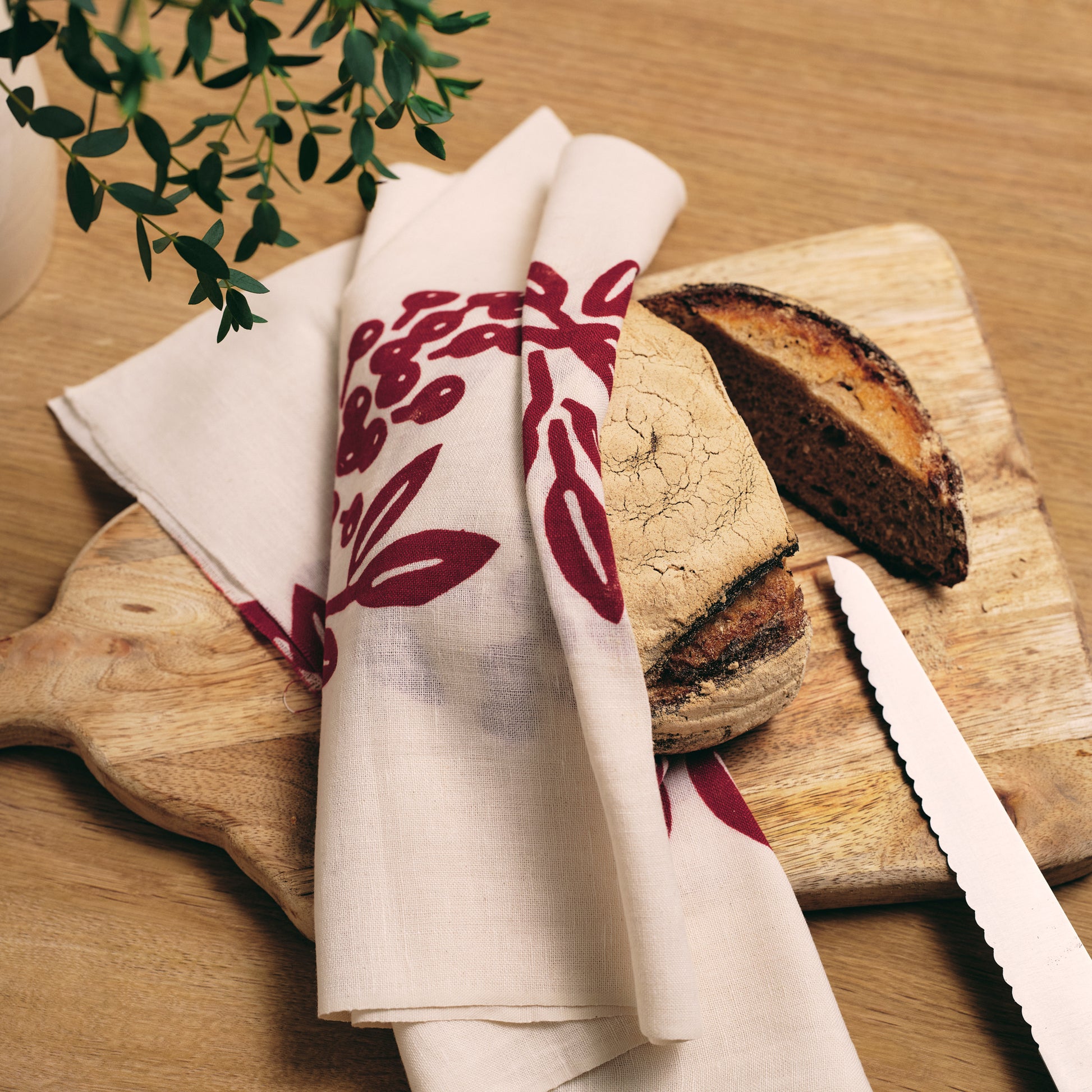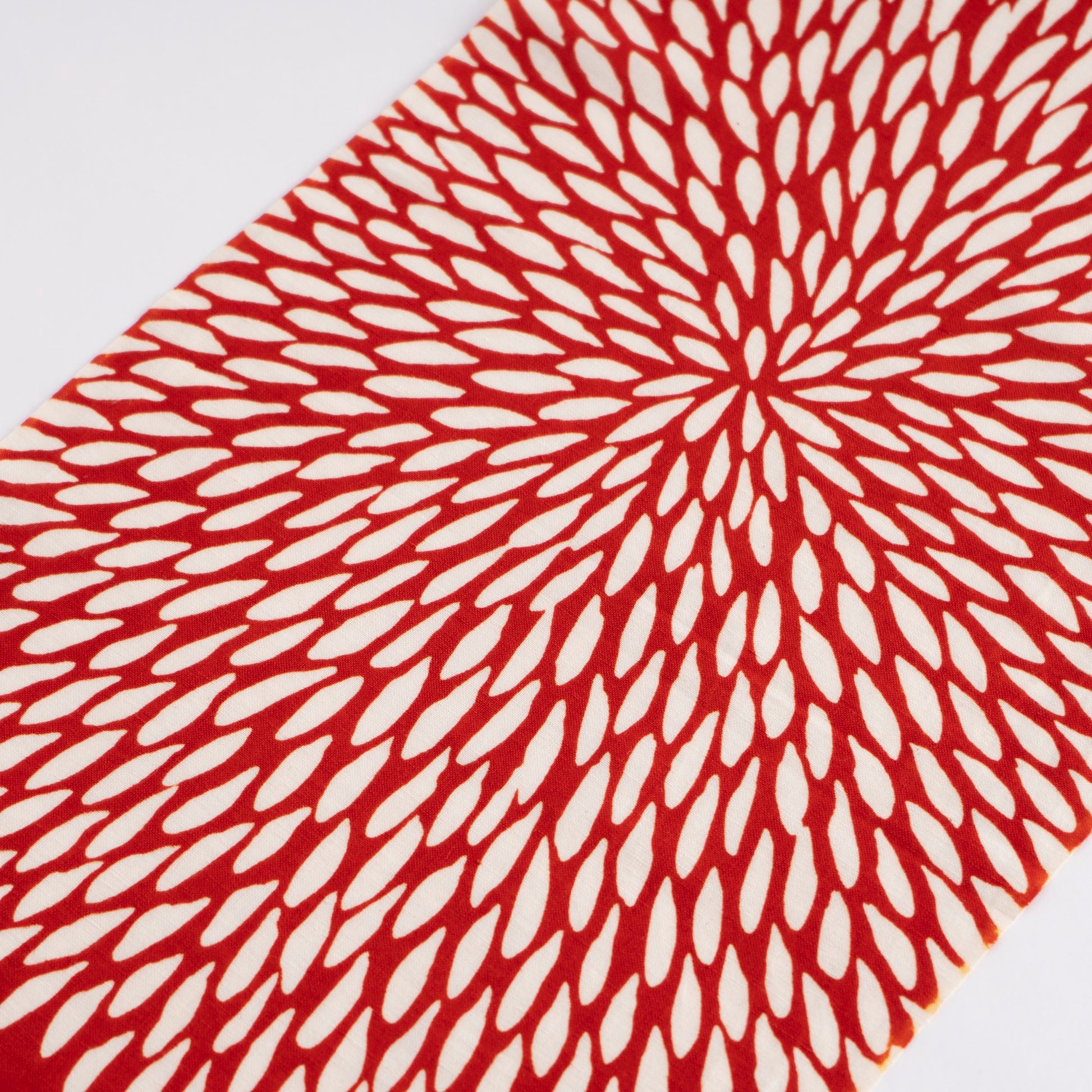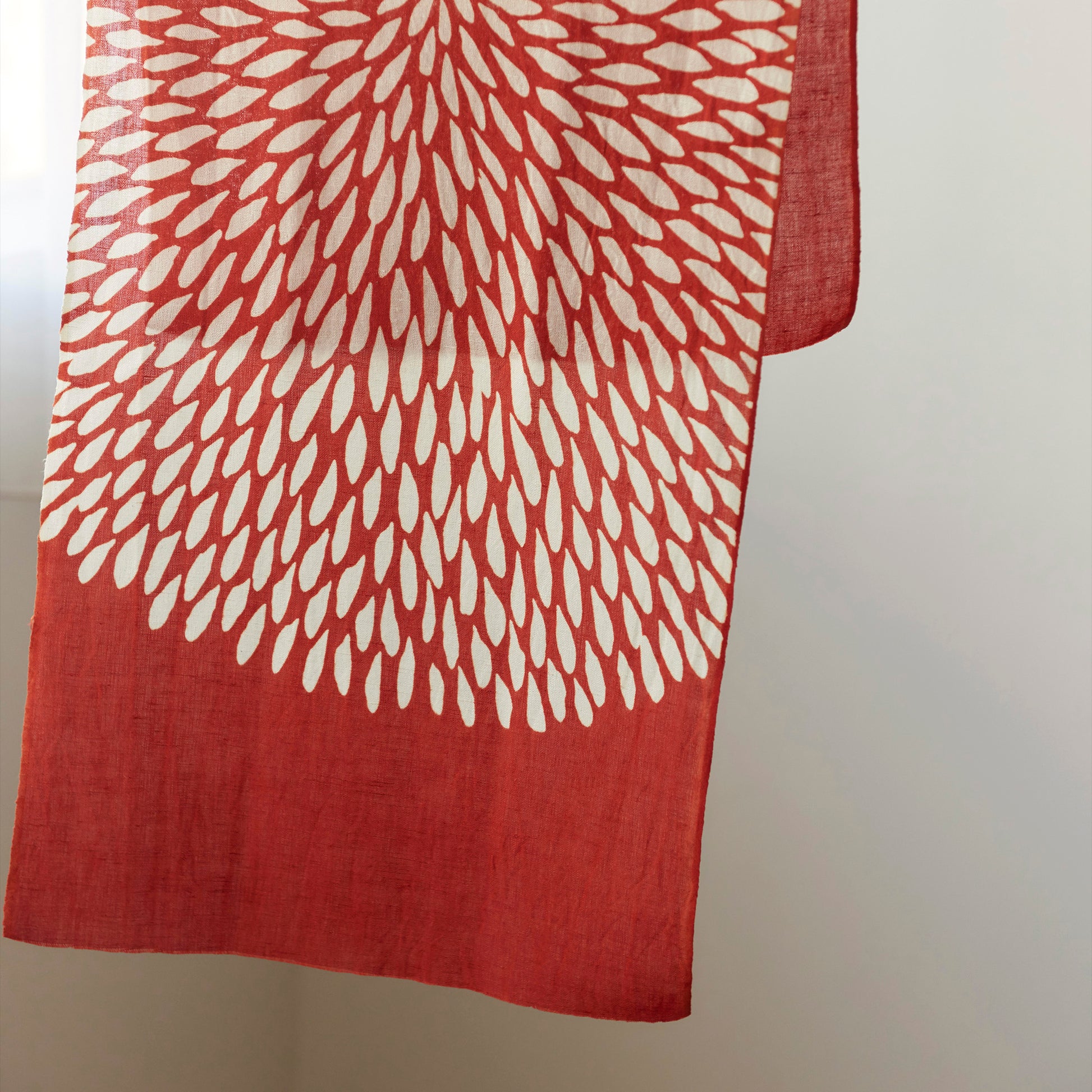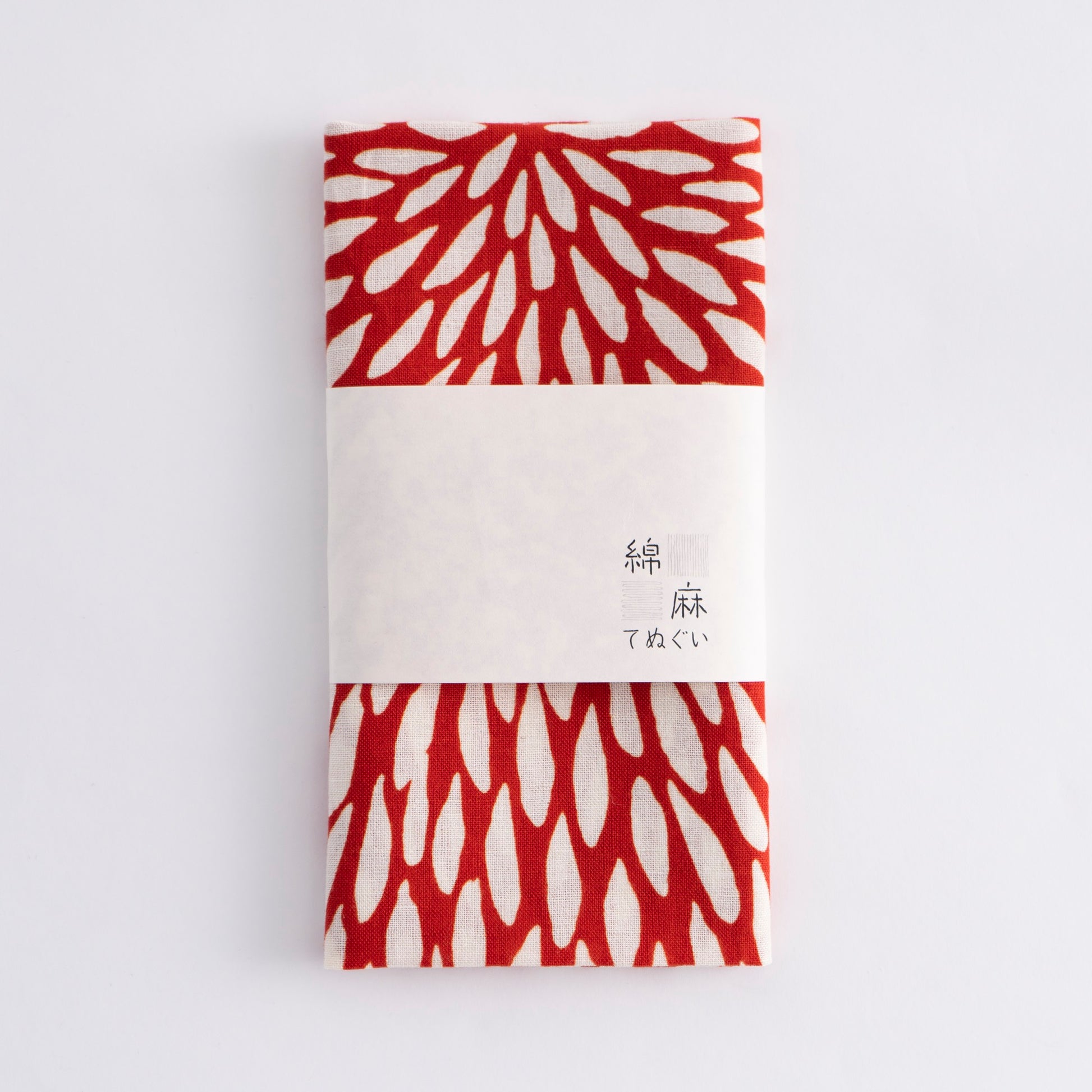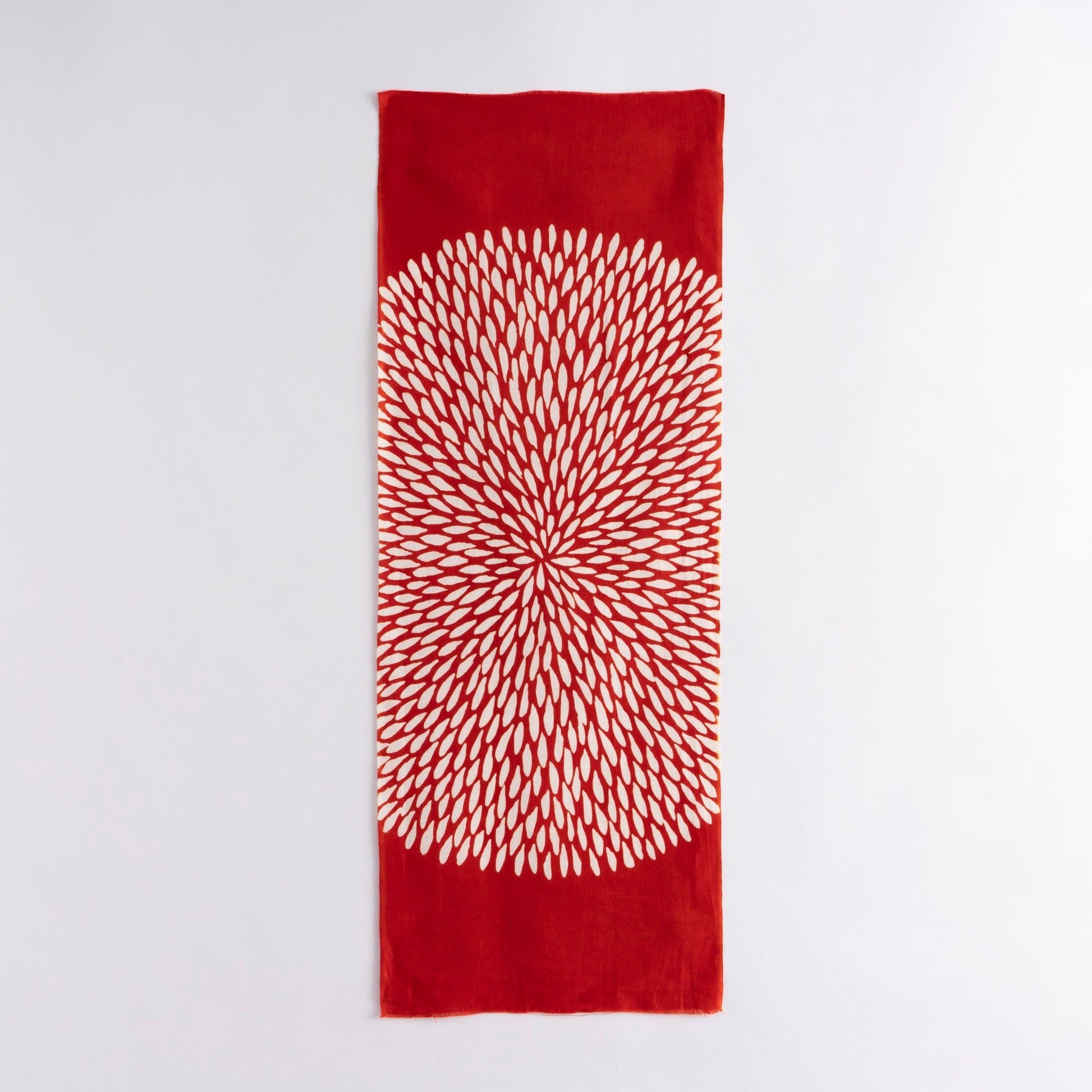 This tenugui towel is about 37cm x 100cm (14in x 39in) and made in Japan of cotton linen woven with cotton warp and linen weft. Cotton and linen tenugui towels are durable, absorbent, and easy to dry. They can be used as table runners, kitchen towels, and tea towels. The design depicts a noble and auspicious "chrysanthemum".