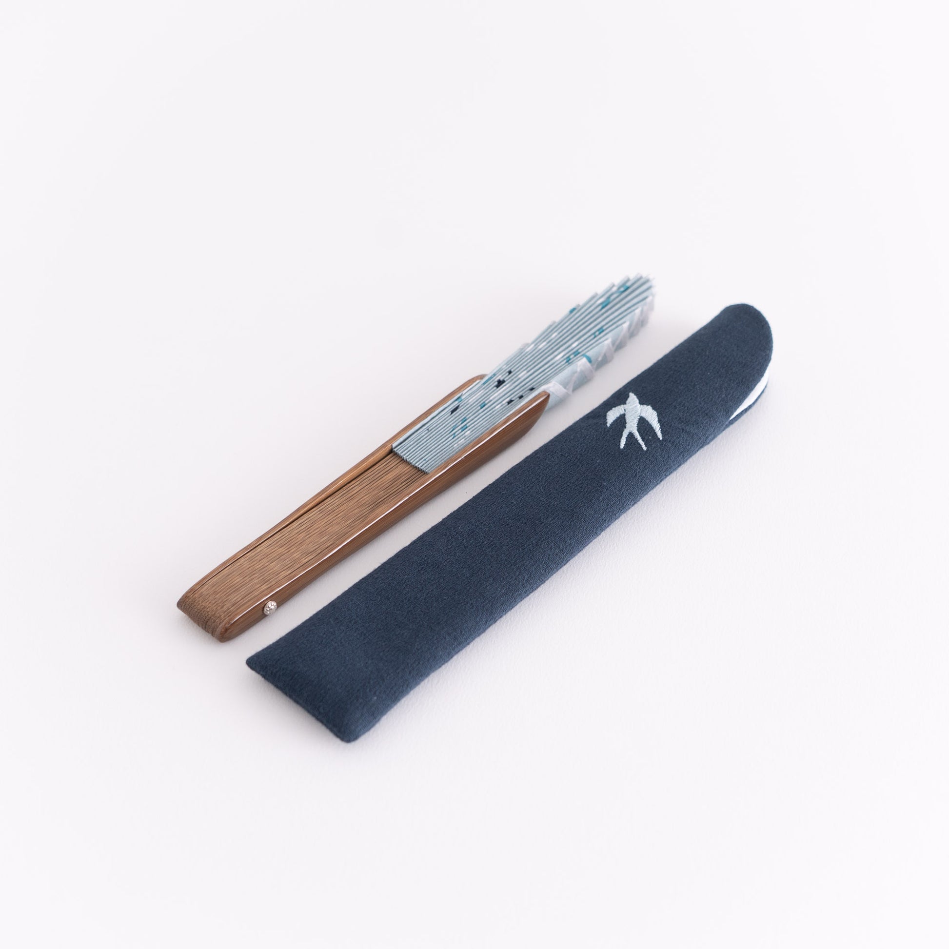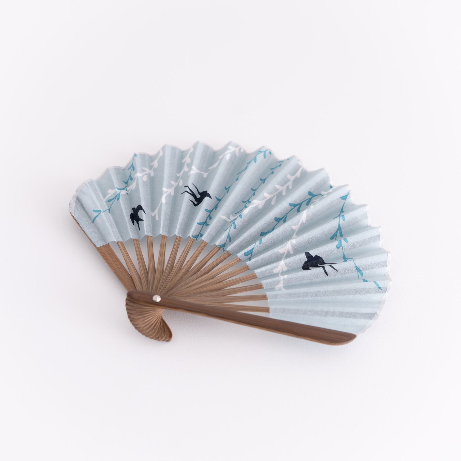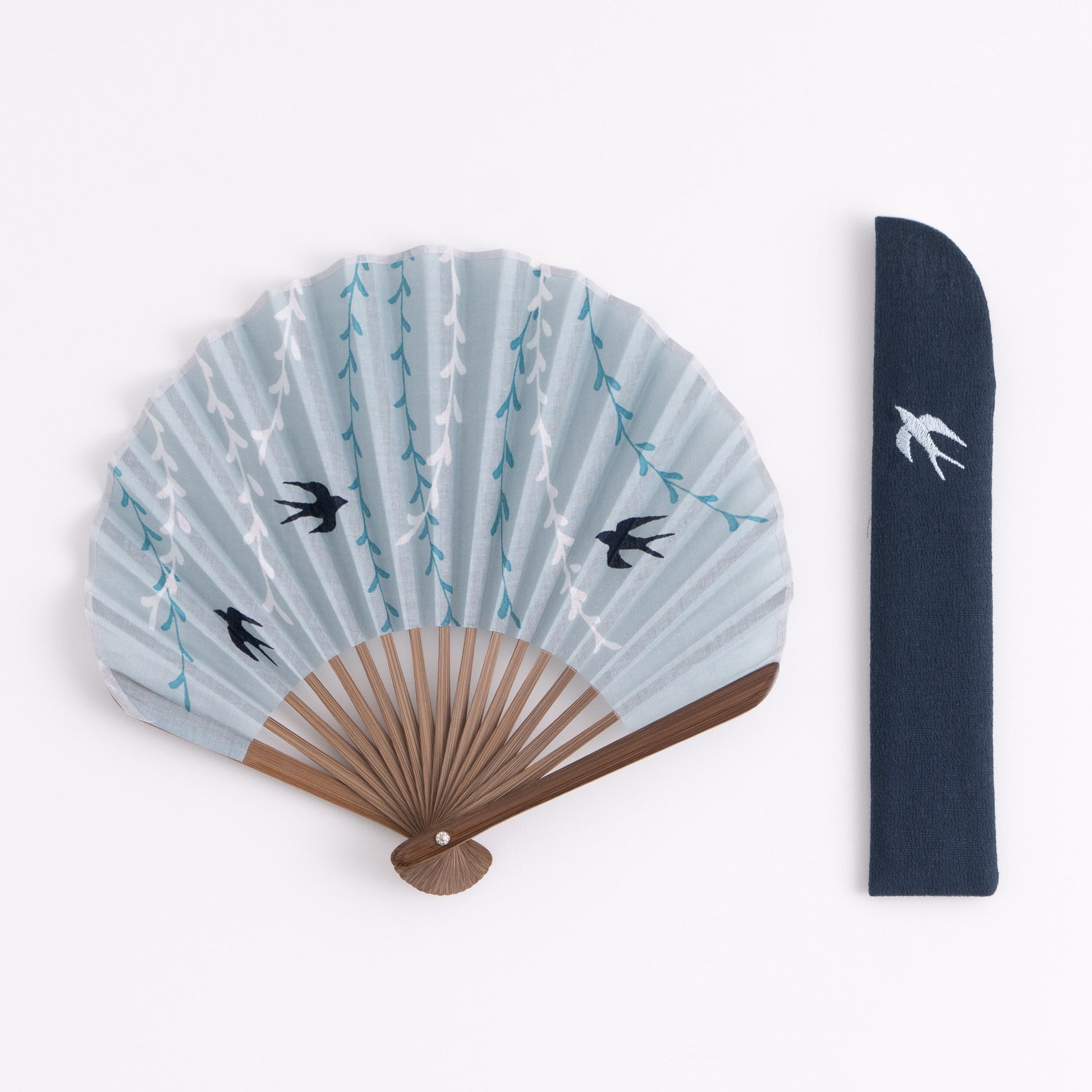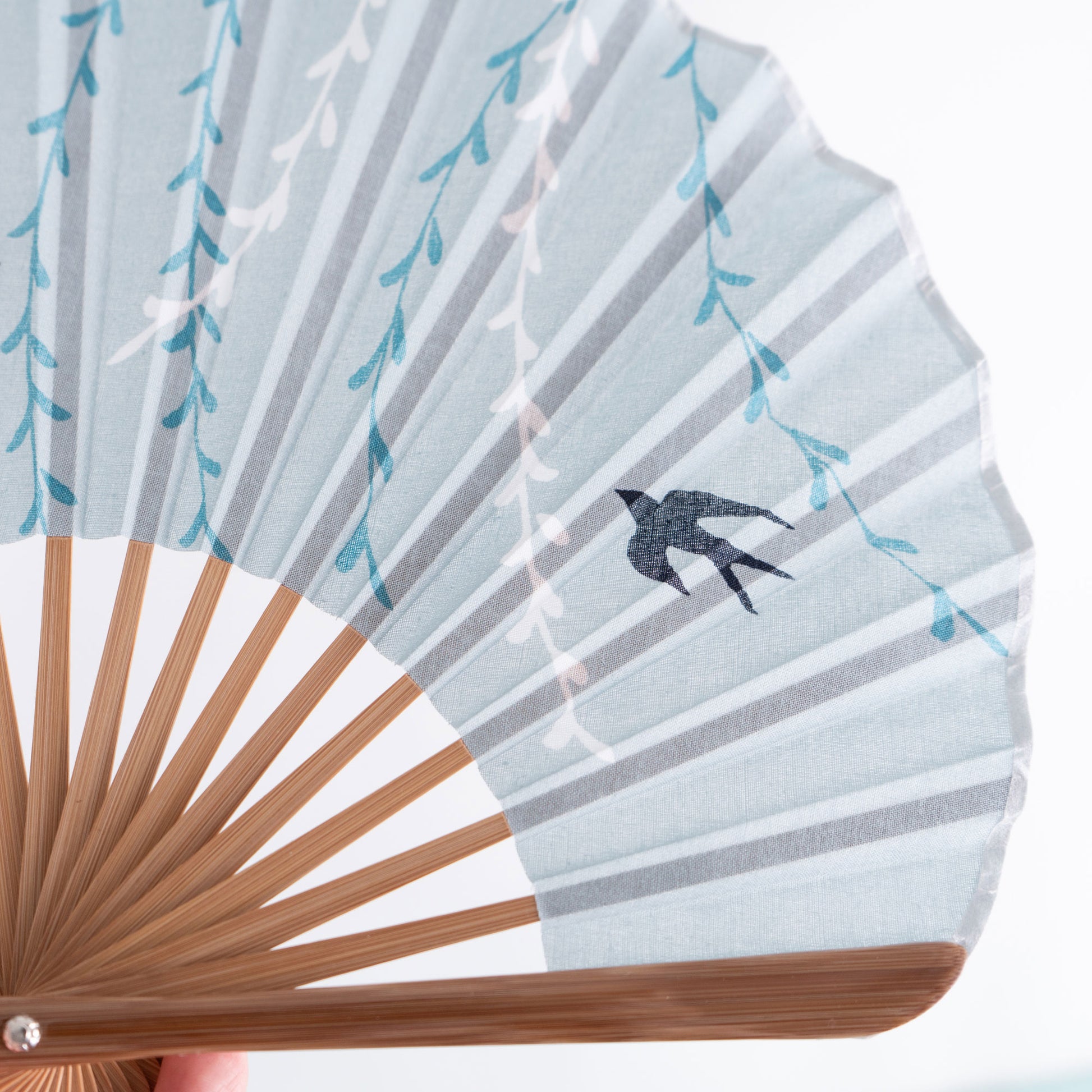 It is said that willows and swallows ward off evil spirits and carry good fortune, and they are a representative combination for an auspicious symbol expressing the spectacle of the beginning of summer. Hence, they have often been used in kimono (Japanese traditional clothing) and obi (kimono sashes) designs since long ago. The design is ideal for a Sensu since it brings a cool breeze and wards off hot air by fanning. The appearance of the pale blue-green color is also refreshing. It is well suited to Japanese clothing, and we recommend it for situations when one is wearing a yukata (light cotton kimono) at a fireworks display or festival.