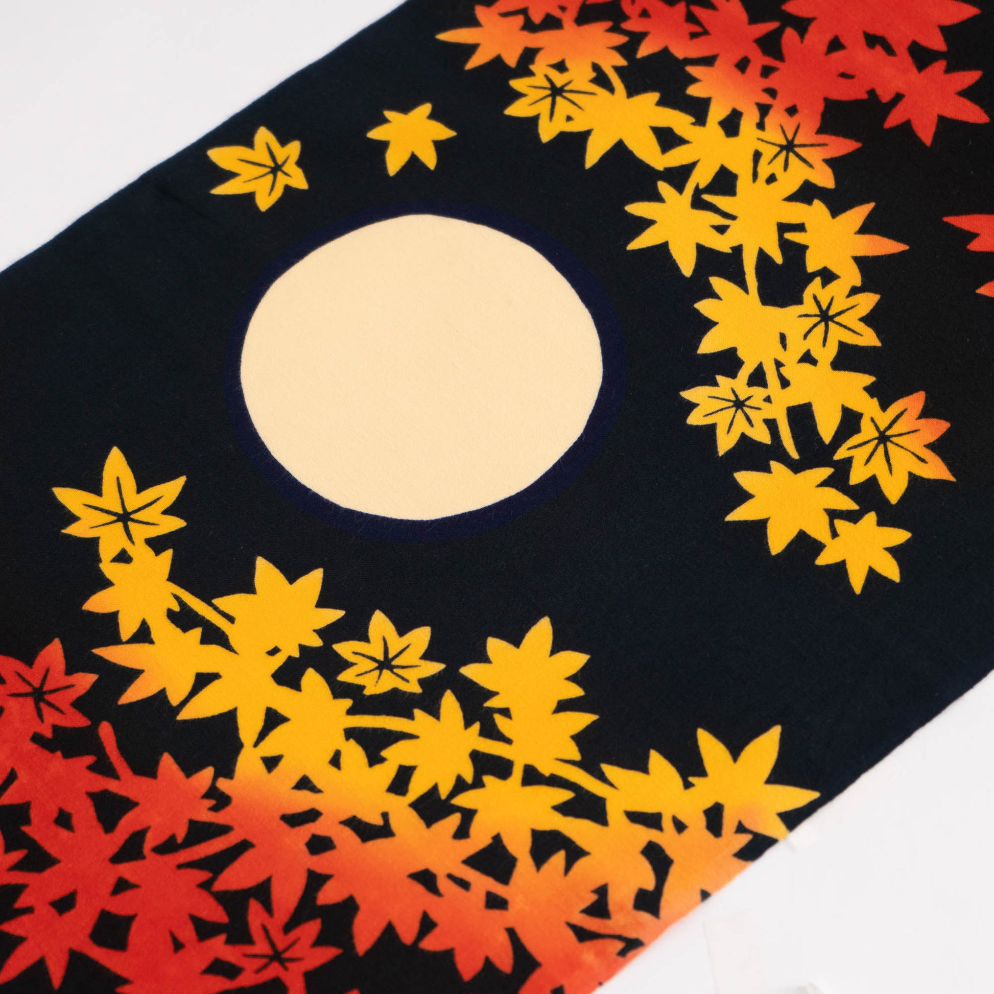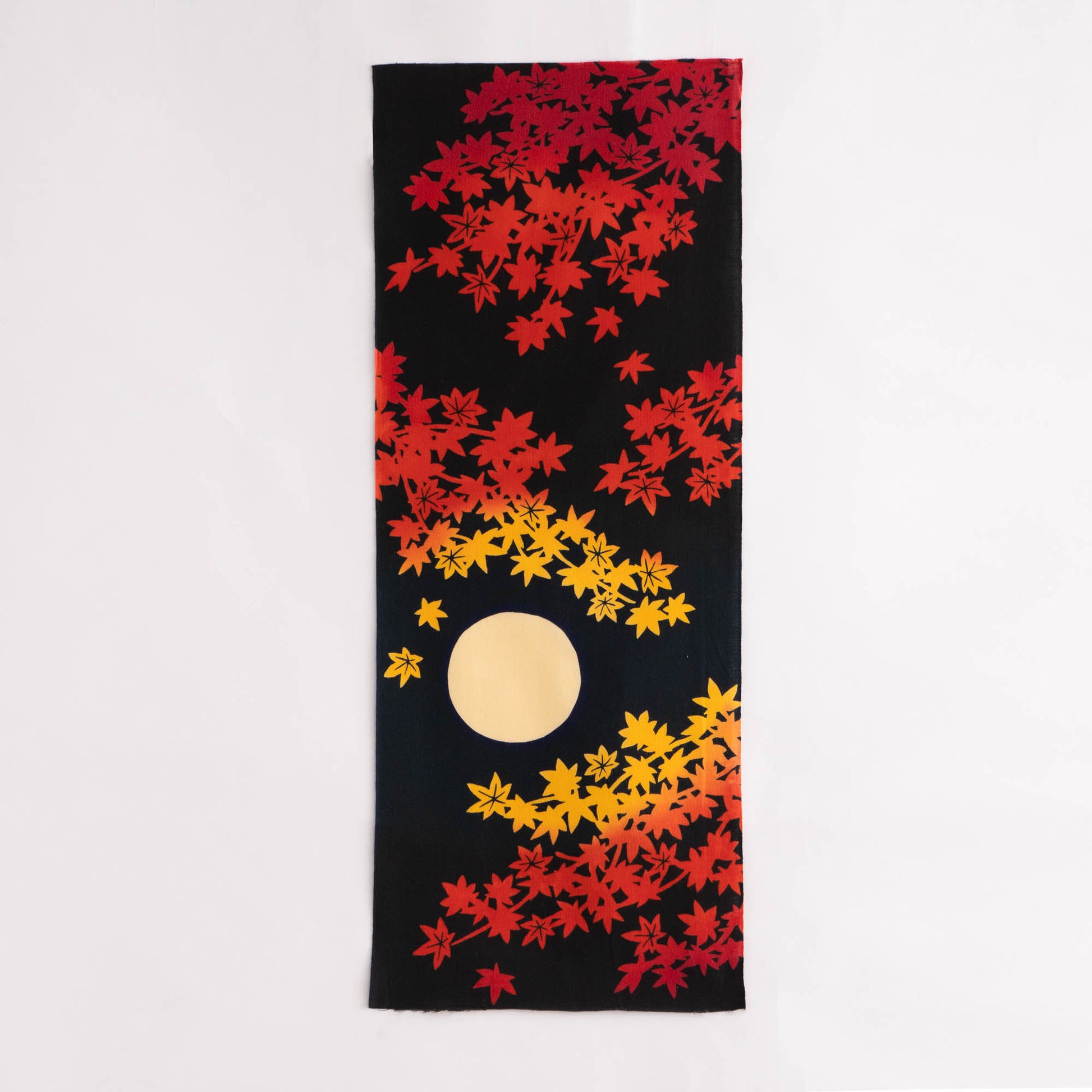 Japan has a custom of enjoying Otsukimi (moon viewing) during September and October. This custom was introduced to Japan from China in ancient times. It is an event to view the moon and express gratitude for the autumn harvest. The bright red autumn leaves, which are representative of Japanese autumn, color the autumn night with the moon's light. It creates a fantastic atmosphere that is different from that of the autumn leaves seen in the daytime. It is recommended to display it in a room with a frame or a tenugui tapestry hanger.