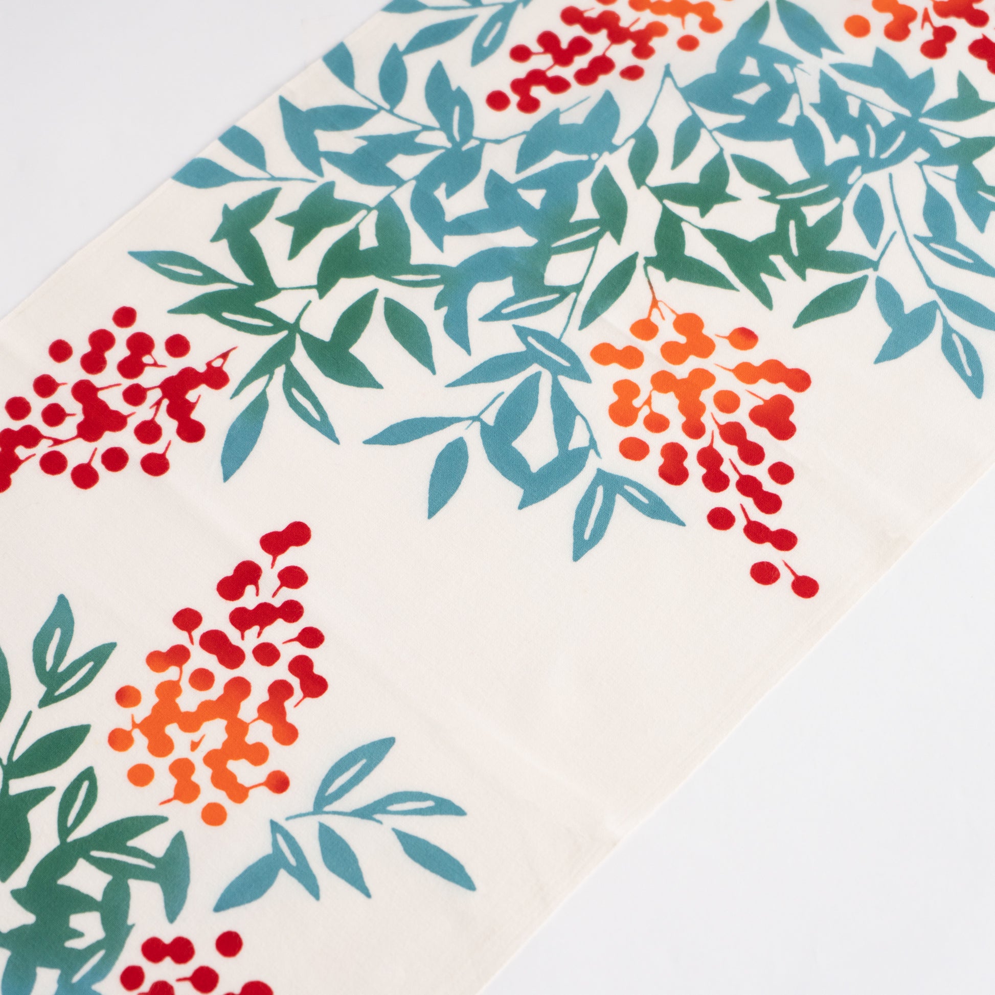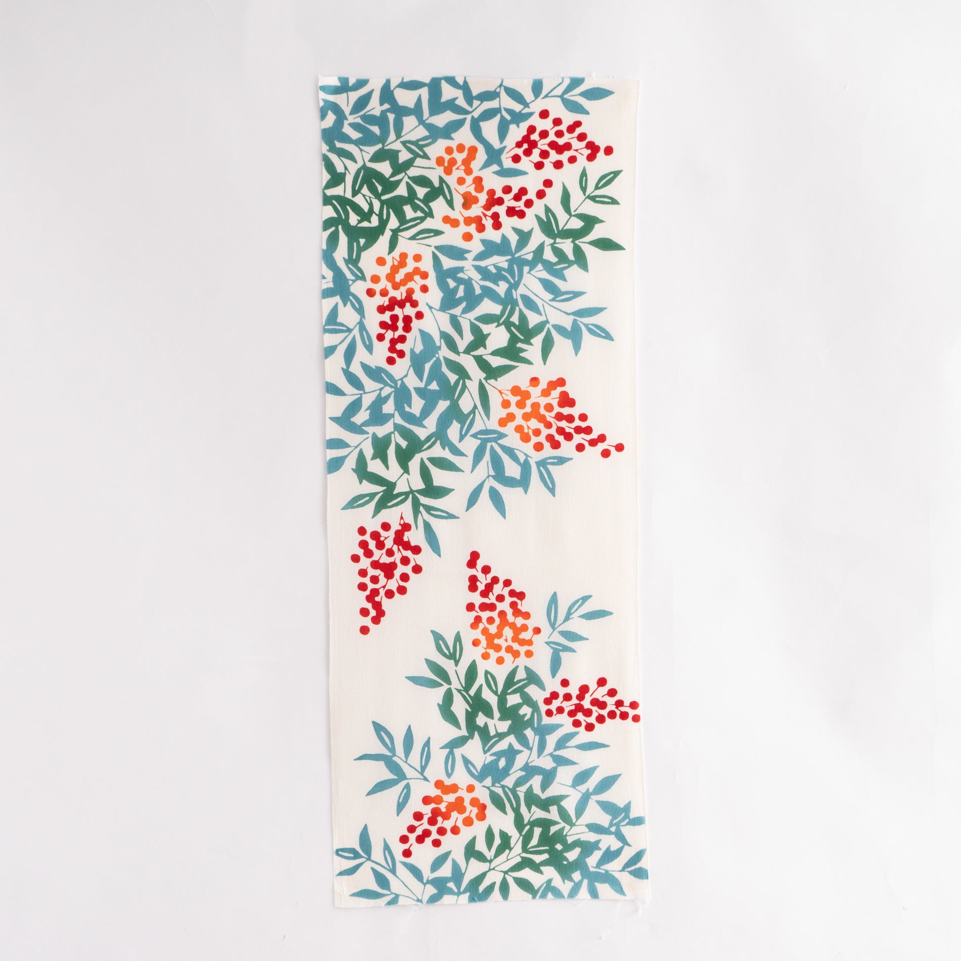 This tenugui features a lucky motif of nanten (heavenly bamboo) with its bright red berries and green leaves. Traditionally believed to “turn misfortune into good fortune,” nanten is cherished as a symbol for warding off bad luck and inviting good fortune. The vibrant red berries, ripening from late autumn into winter, add a festive splash of color to any space.