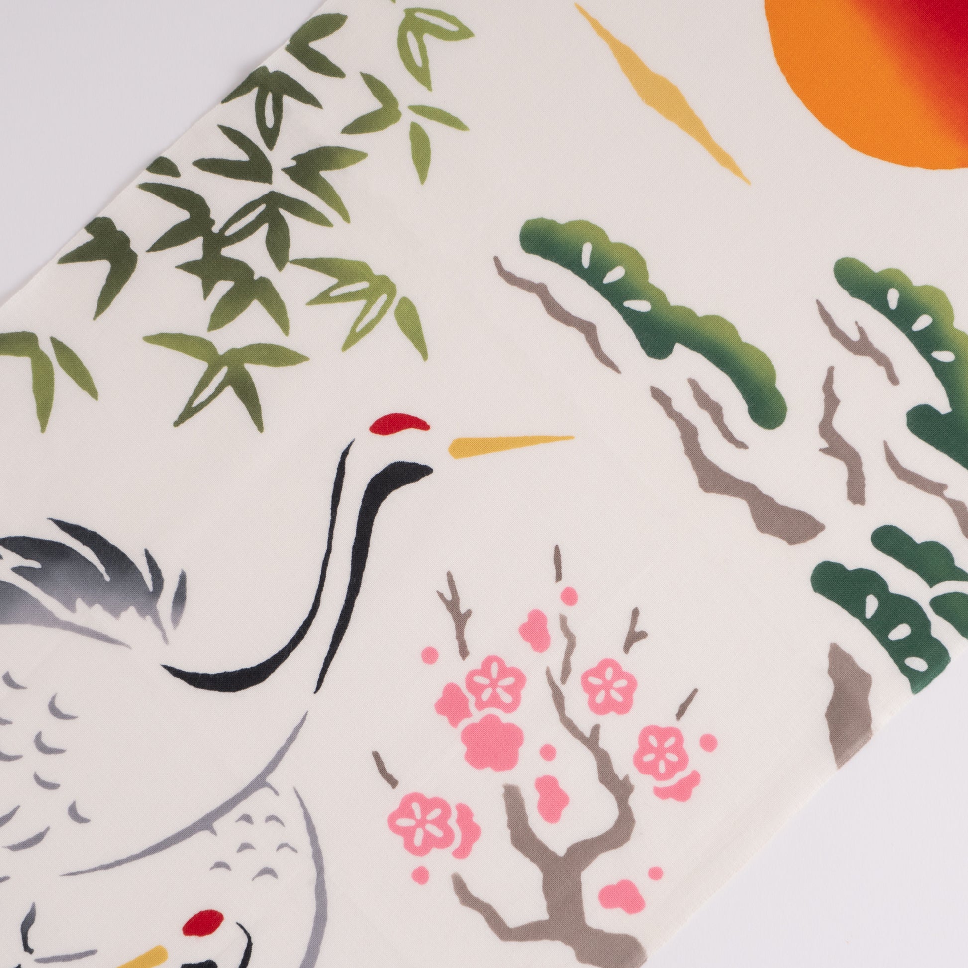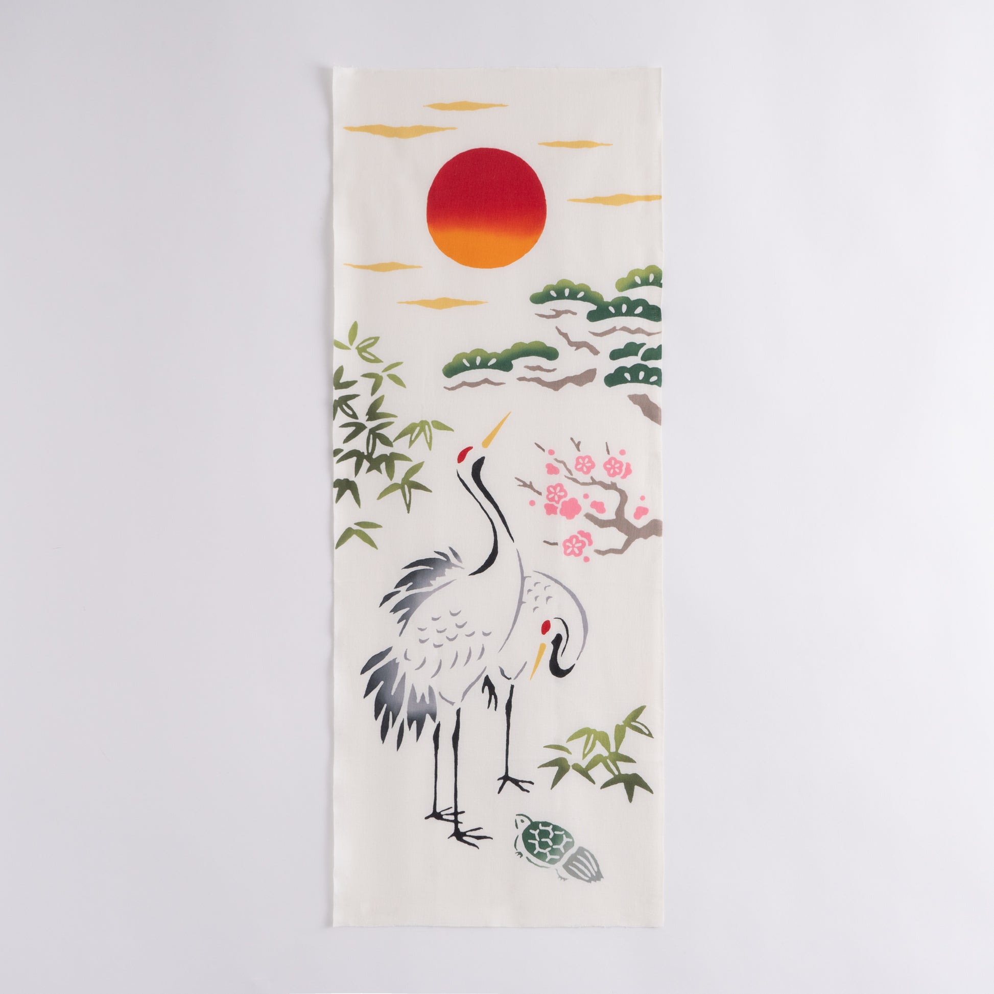 This pattern depicts cranes, turtles, pine, bamboo, and plum, which have long been considered a motif of good luck in Japan. The cranes and turtles symbolize long life. The crane and turtle symbolize longevity, and the Three Friends of Winter are beloved as auspicious plants because the plum, bamboo, and pine trees never cease to bloom and leaf even in winter.