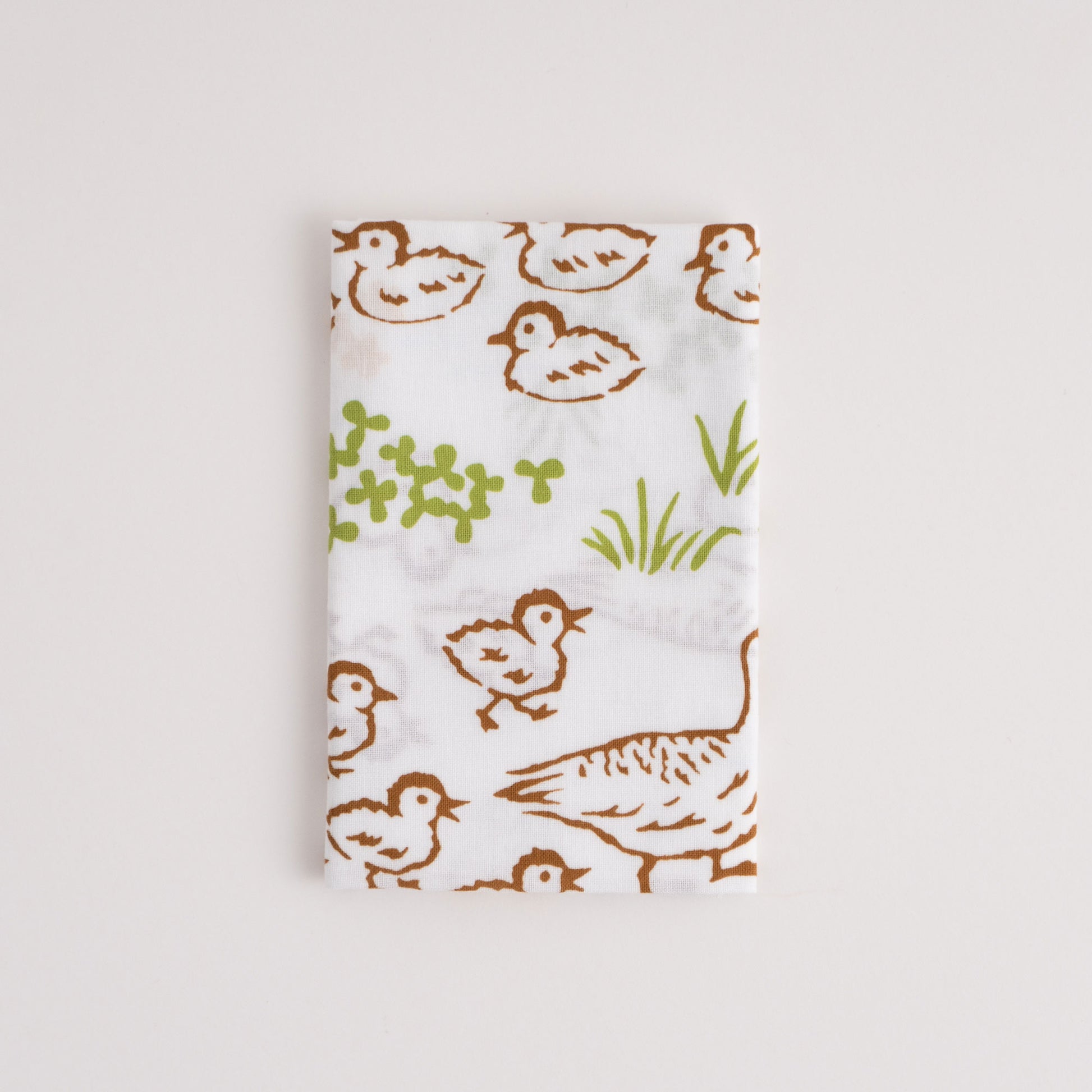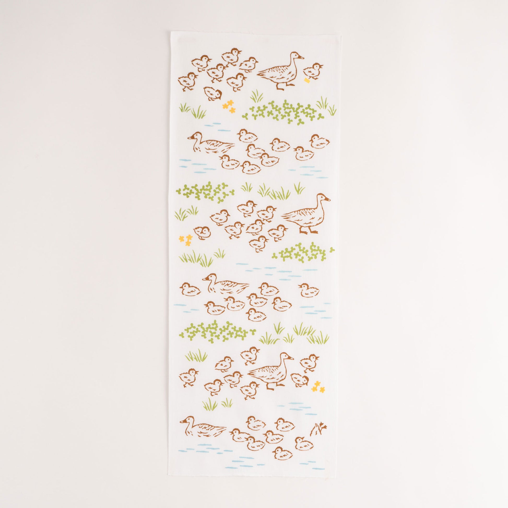 In Japan, this is a scene of a family of ducklings moving into a new home, which can be seen in a stream in spring. This heartwarming hand towel expresses the loveliness of the ducklings as they try their best to follow the parent ducklings. The fluffy feathers and waddling movements are depicted with a gentle touch. Please look for the four leaves hidden in the picture.