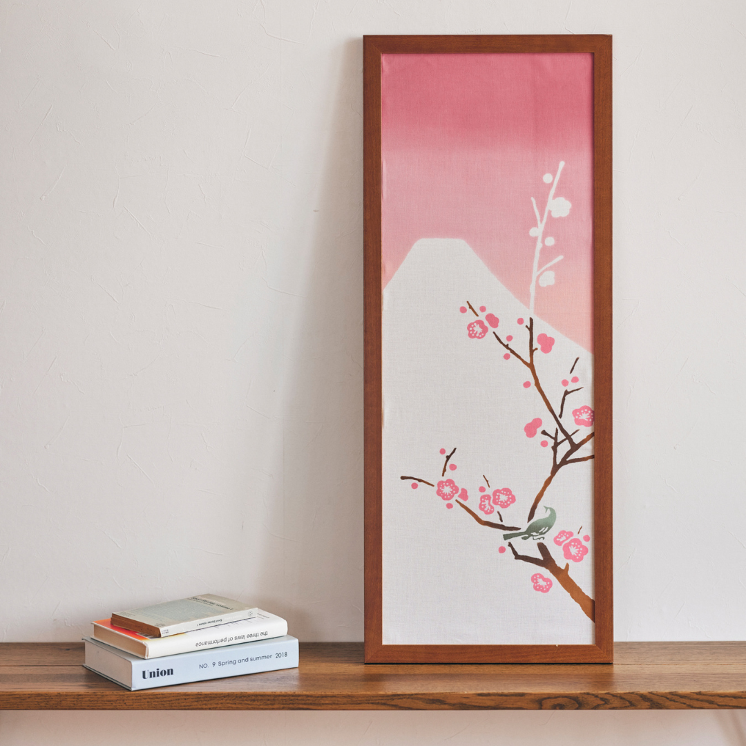 Just before the year's first sunrise, the eastern sky gradually brightens, taking on a beautiful hue known as 'Hatsuakane' (first blush of dawn). This tenugui employs the unique chusen dyeing technique to elegantly capture the scene of the sky transitioning into shades of madder red accompanied by Mount Fuji. The design also features plum blossoms and the Japanese nightingale, birds that herald the arrival of spring, making it an ideal choice for the holiday season.