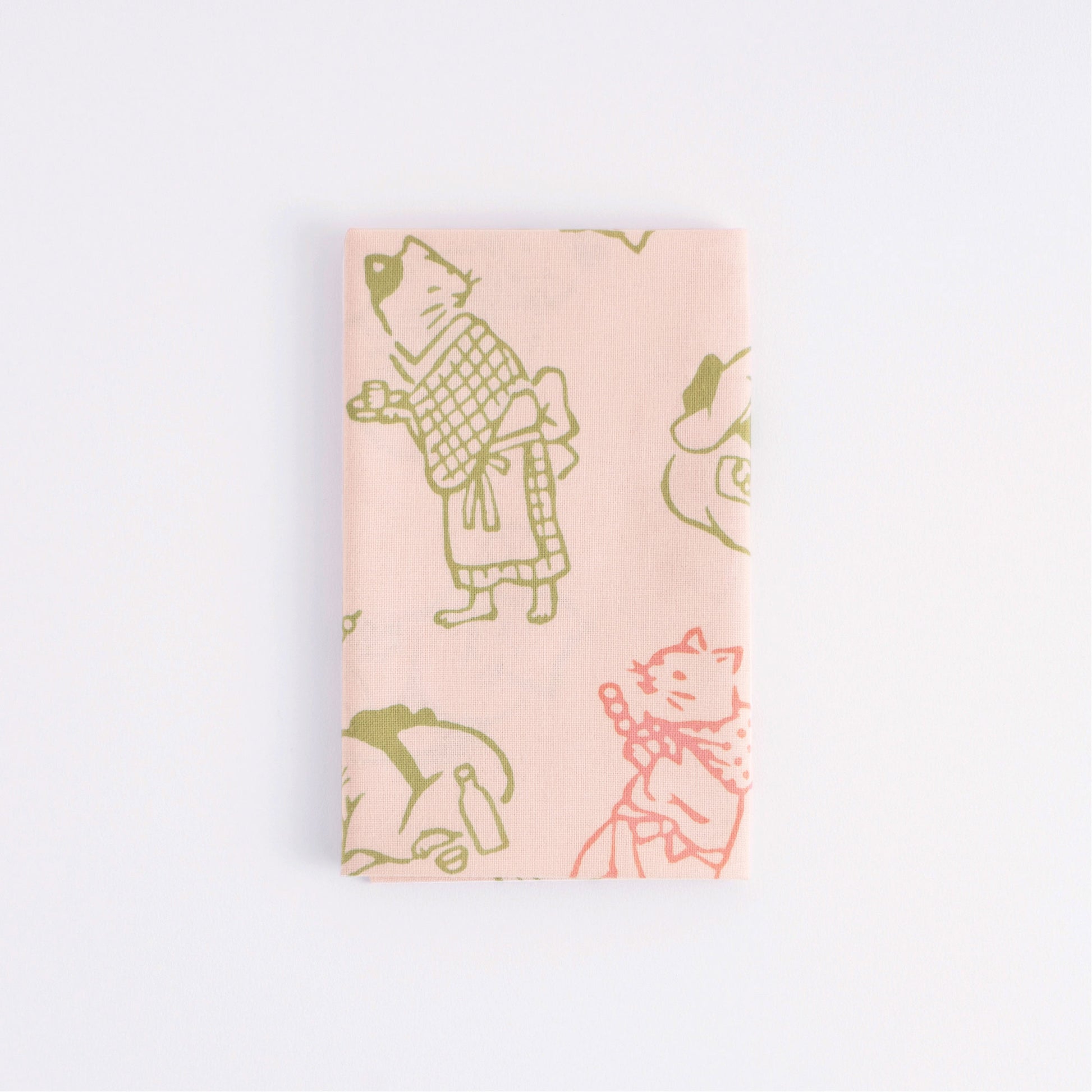 Based on anthropomorphic cats that appear in ukiyo-e toy paintings, these diatonically unique tenugui hand towels depict cats relaxing at a sweet shop. The cats spend their time at the sweet shop eating dango, carrying tea, drinking sake, and snoozing. They are the perfect accompaniment for cherry blossom viewing and spring strolls. They are dyed in the color of “sakura mochi,” a Japanese sweet representative of spring in Japan.
