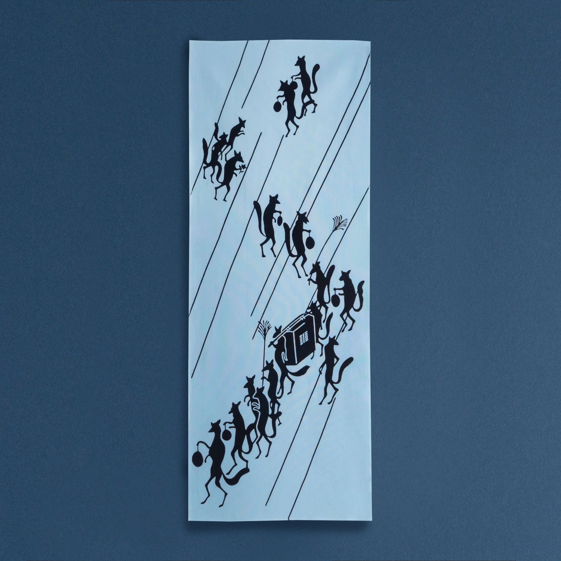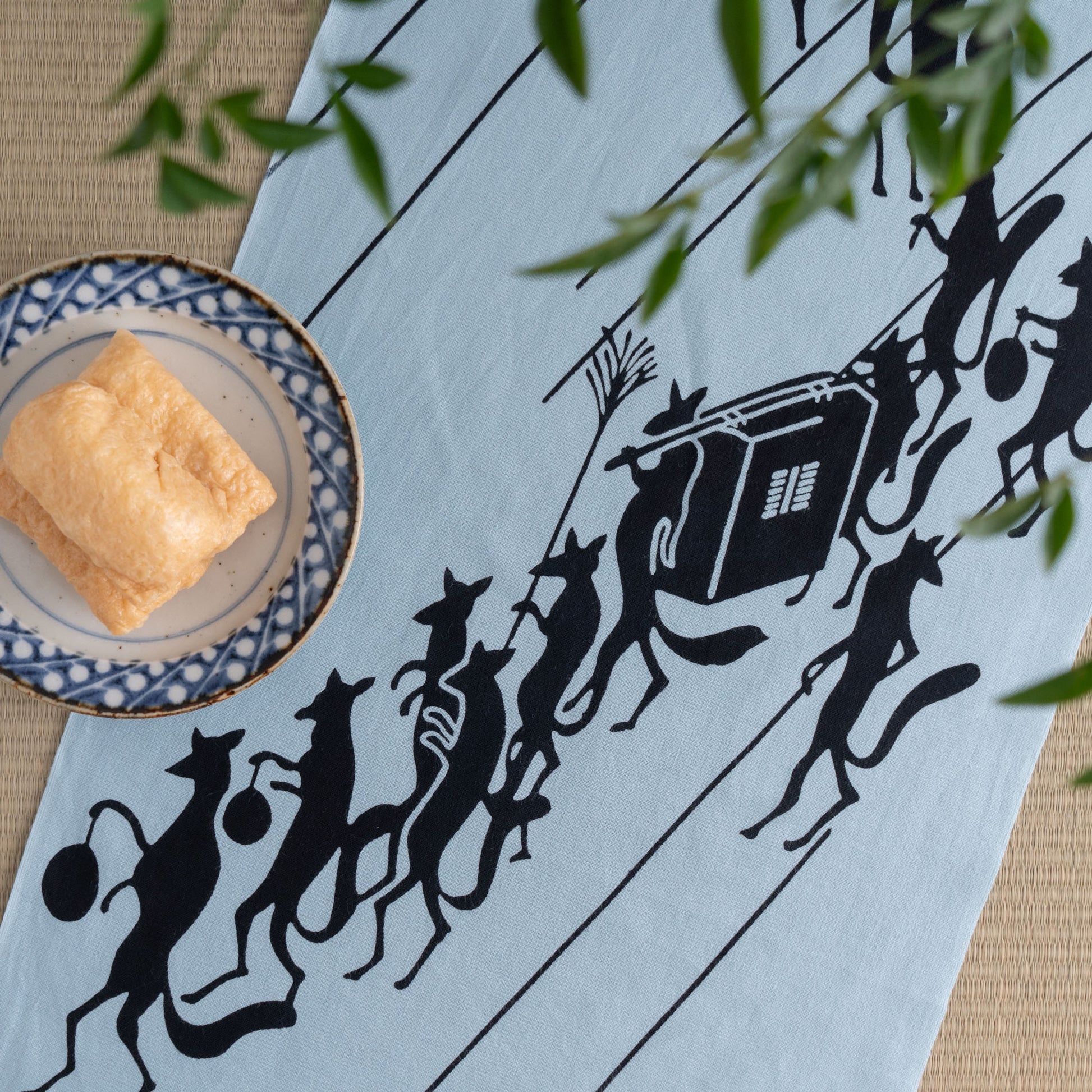 This tenugui is a refreshingly cool depiction of the mystical Japanese legend of a fox wedding procession.