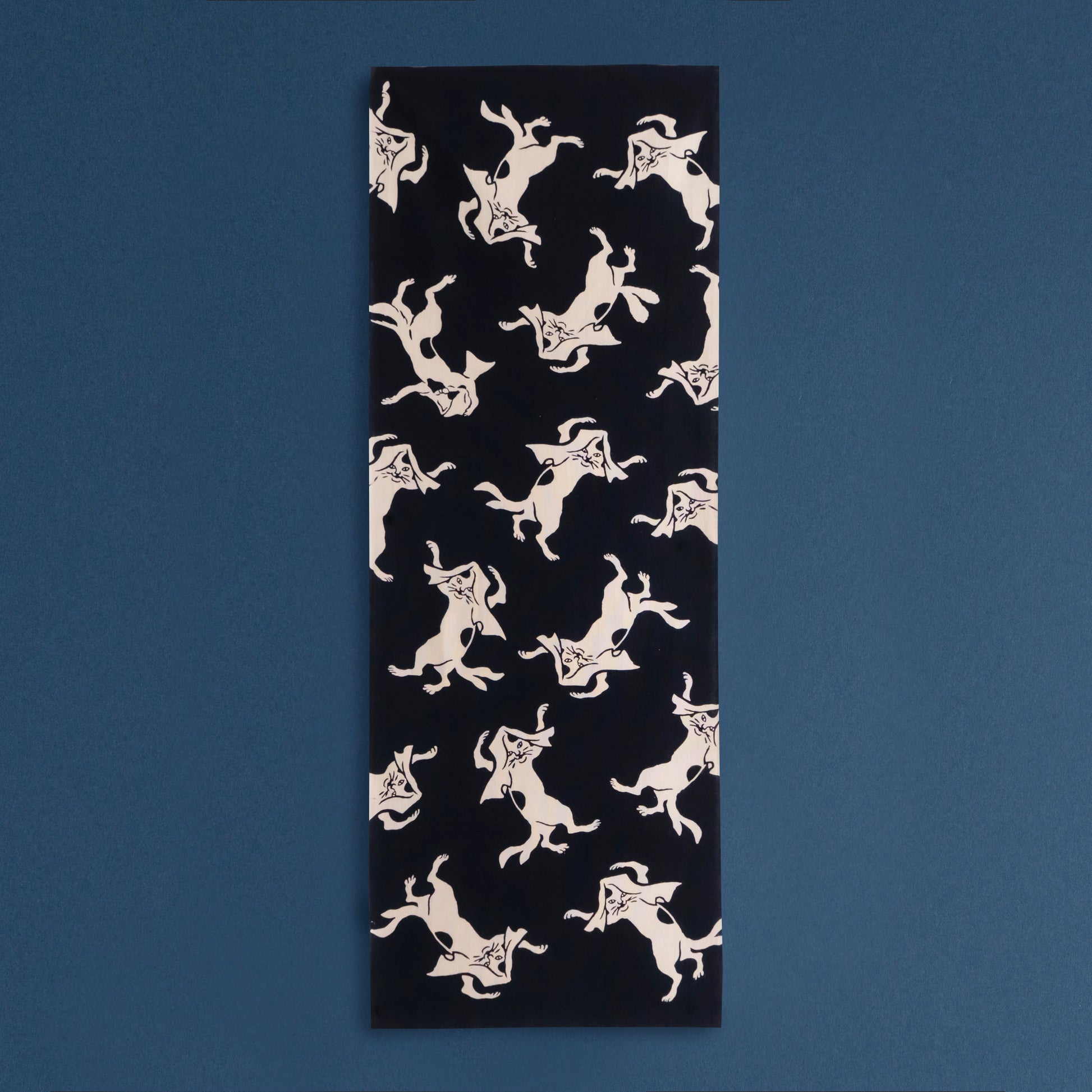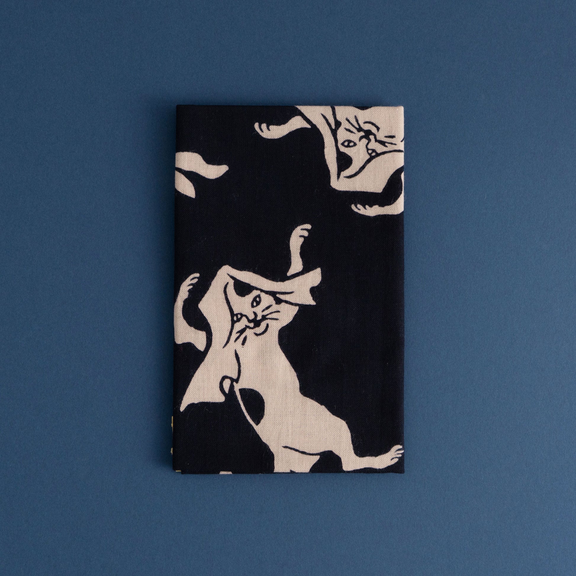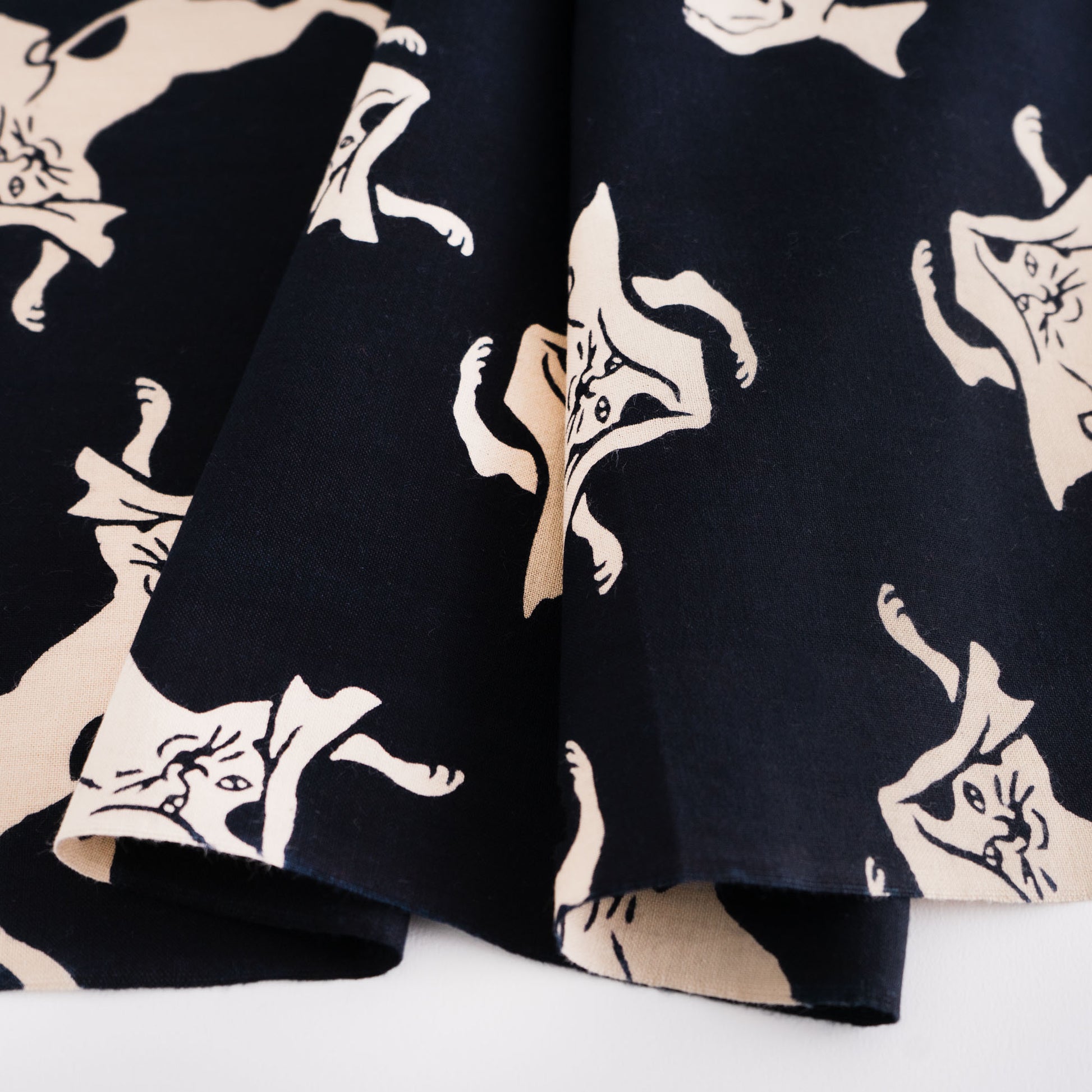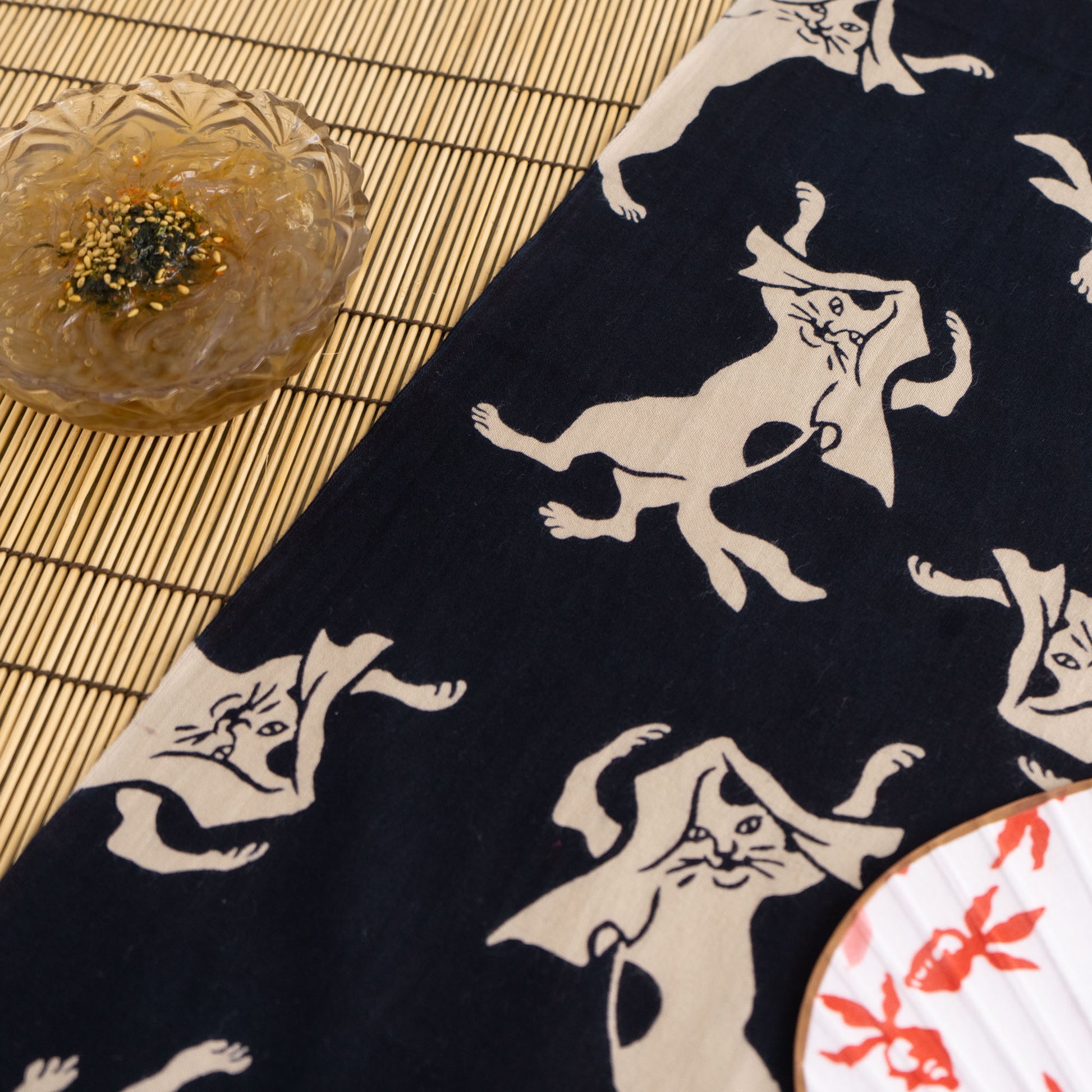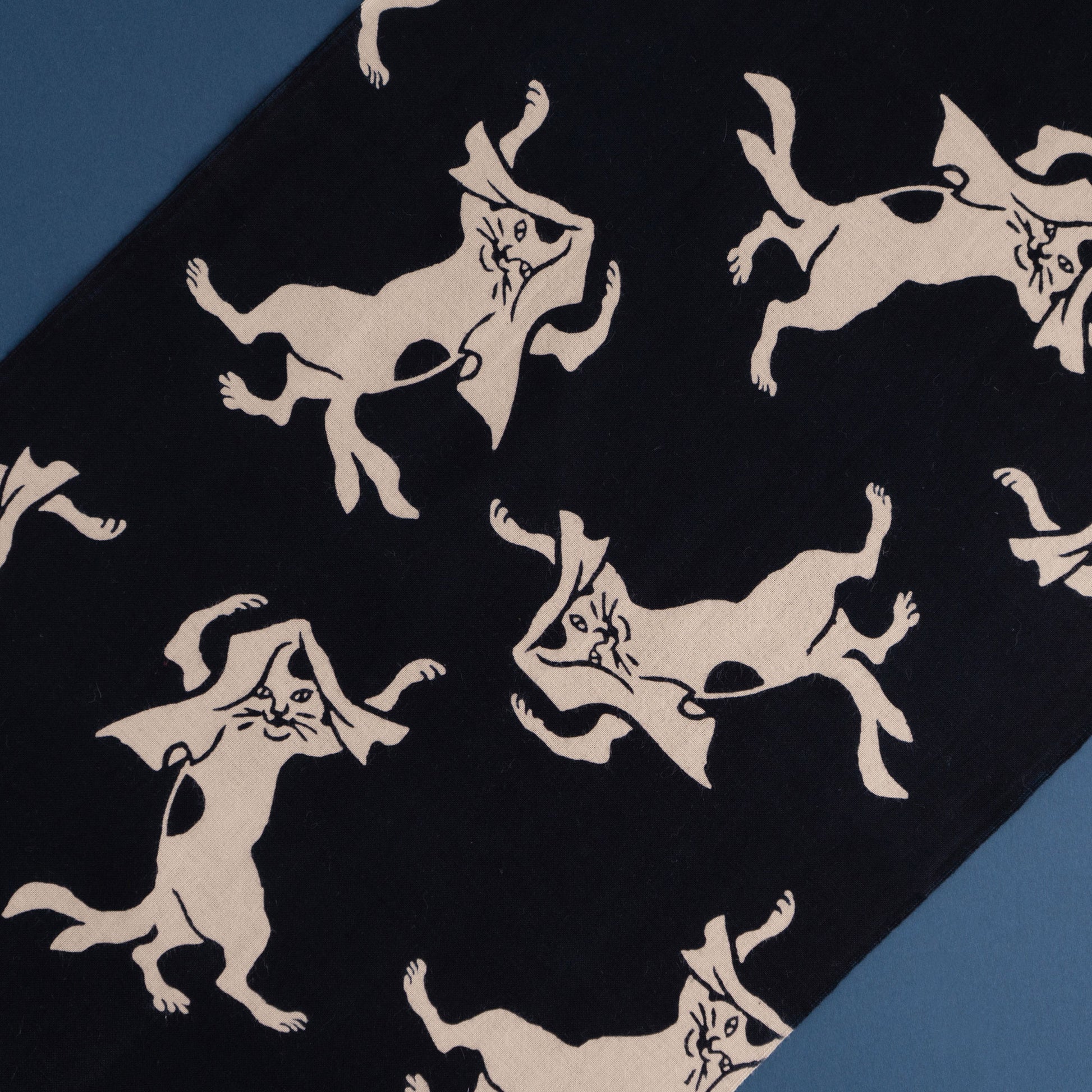 This tenugui depicts nekomata dancing in the dark. Japanese lore tells of cats who turn into yokai when they grow old, after being kept as pets by people for many years.