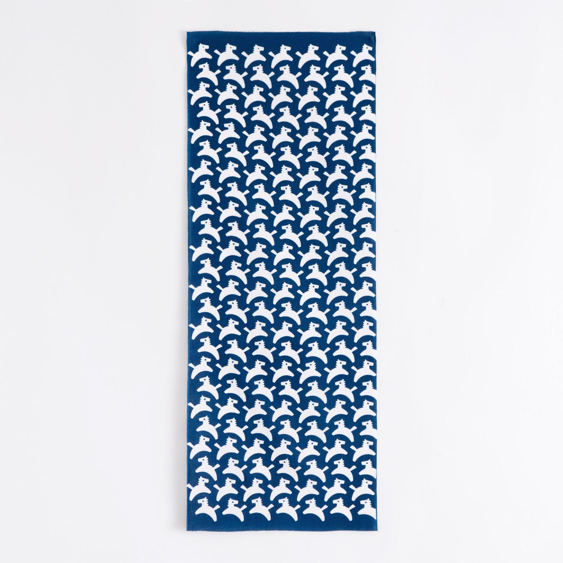 This tenugui features a simple, repeating pattern of horses moving in a row. The dynamic motion of the prancing horses conveys a wish for a prosperous year ahead. Occasionally, a horse looking backward adds a playful accent to the design. The pattern is hand-dyed in a deep navy on plain white bleached cotton fabric.