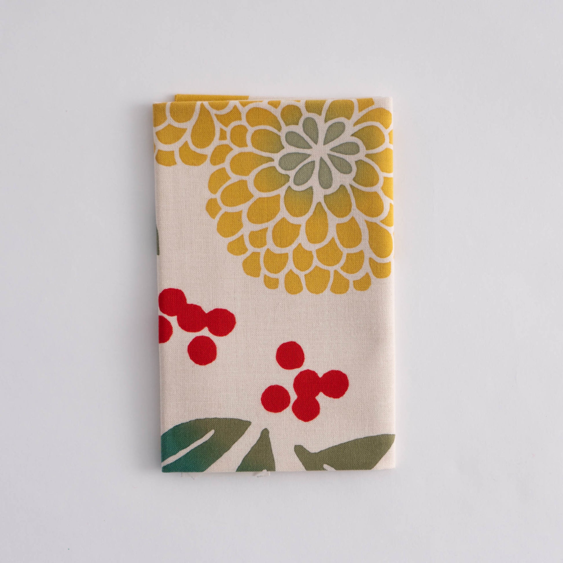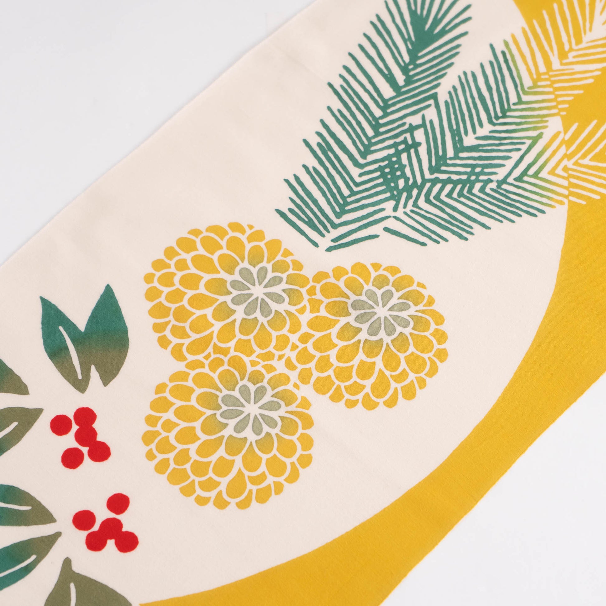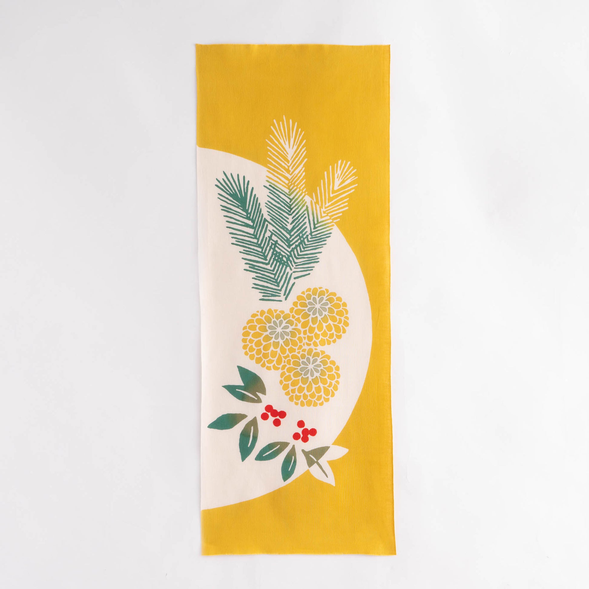 This tenugui features a modern, auspicious design combining circular motifs with young pine, round chrysanthemums, and senryo (Sarcandra glabra). Pine and chrysanthemums symbolize longevity, while senryo represents wealth and prosperity. Arranged together within the harmonious circular forms, the design expresses wishes for happiness and abundance in the coming year.