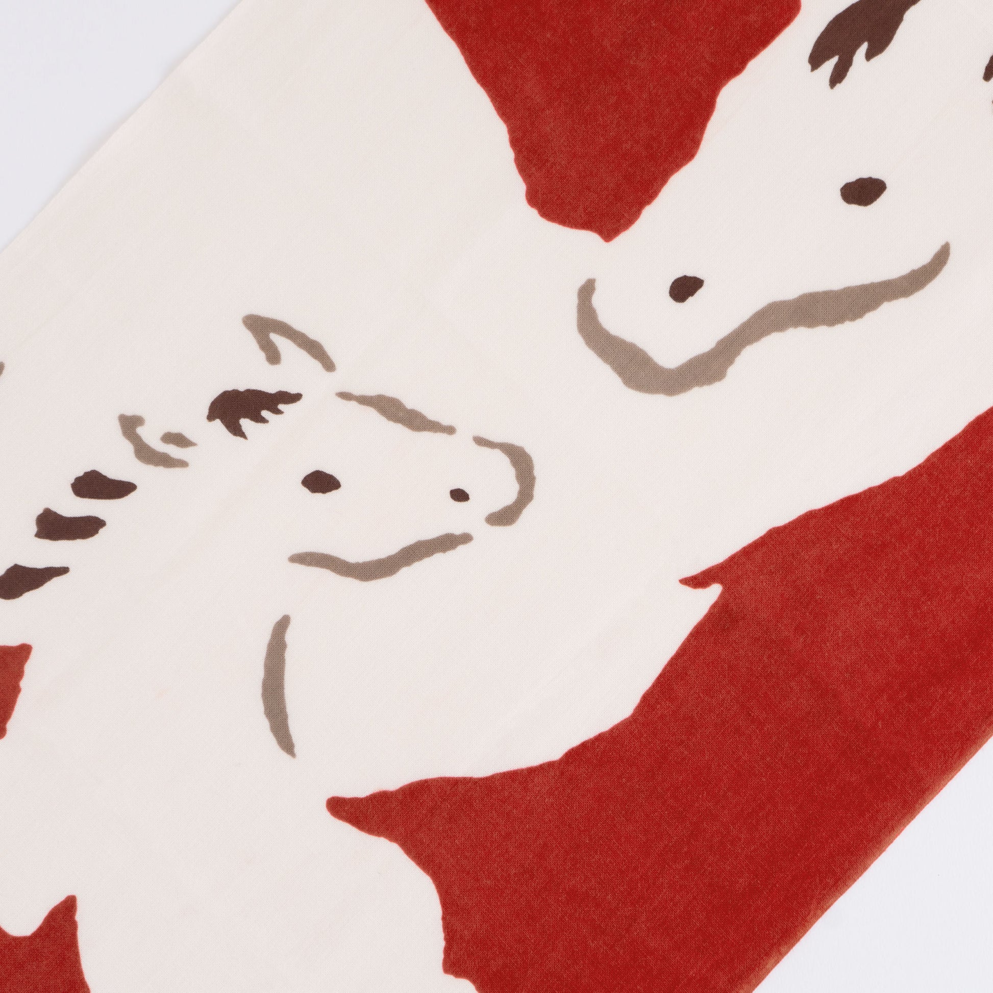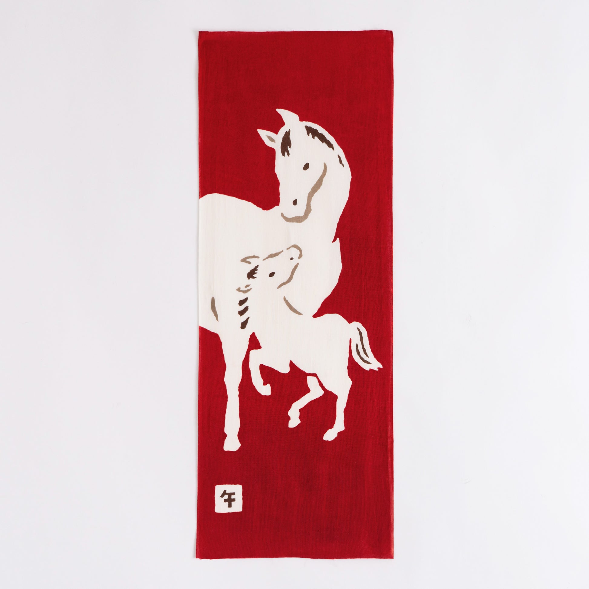 This tenugui depicts a heartwarming image of a parent horse and foal nestled close together. The design conveys a wish for family harmony, with the horses’ outlines beautifully hand-dyed in shades of brown and light-brown using skilled artisan techniques. With its picture-like composition, it also makes a lovely decorative piece when displayed on a wall or shelf.