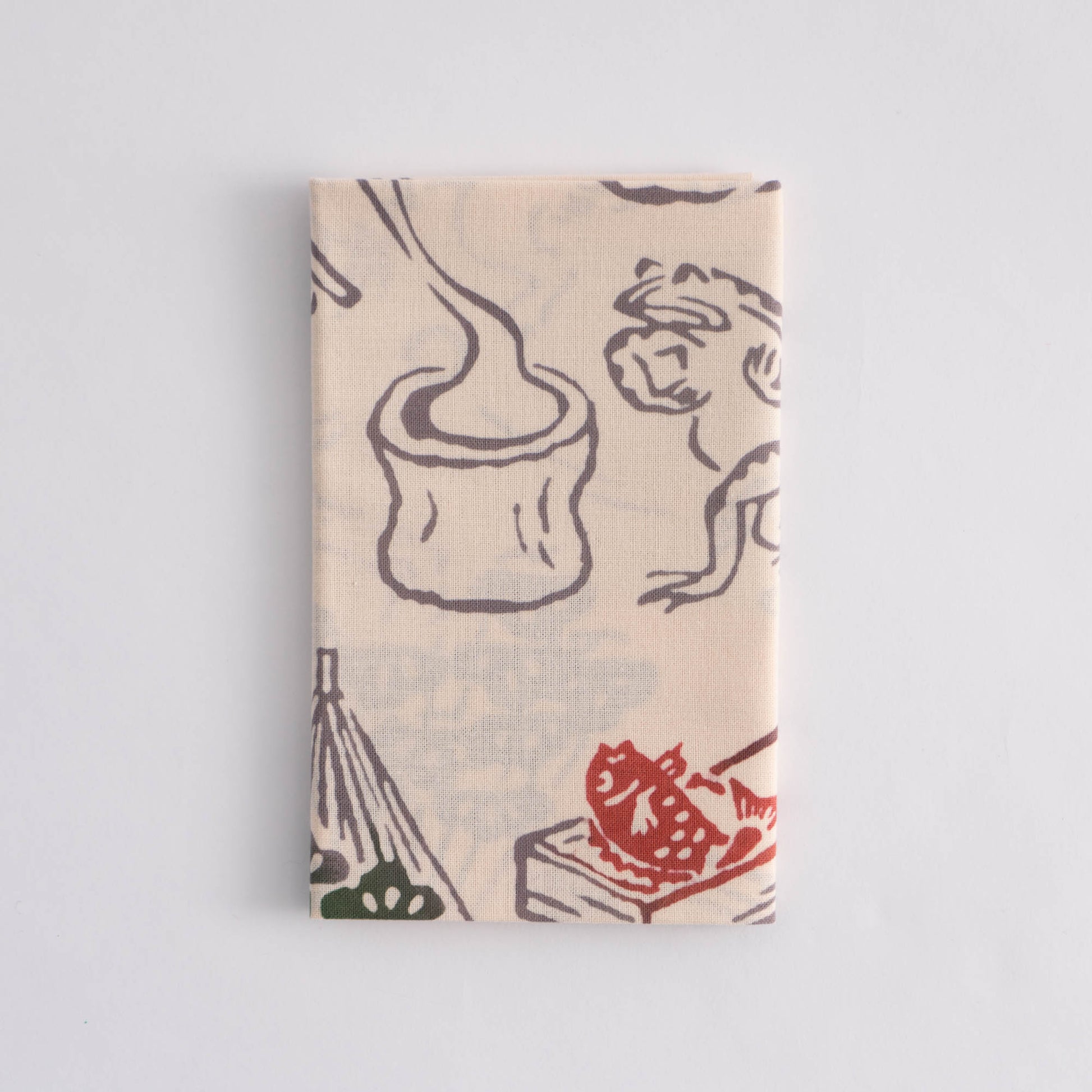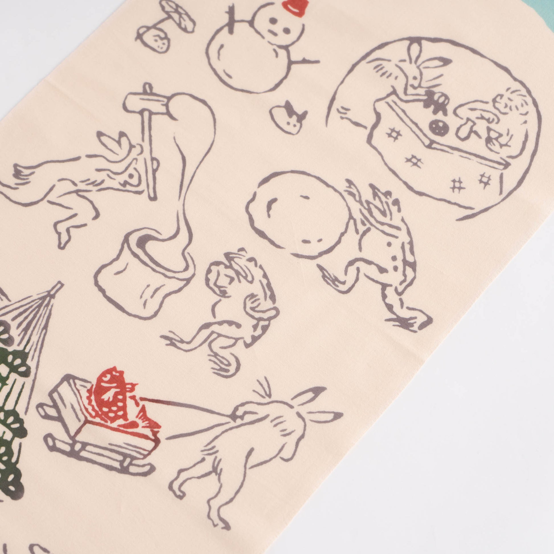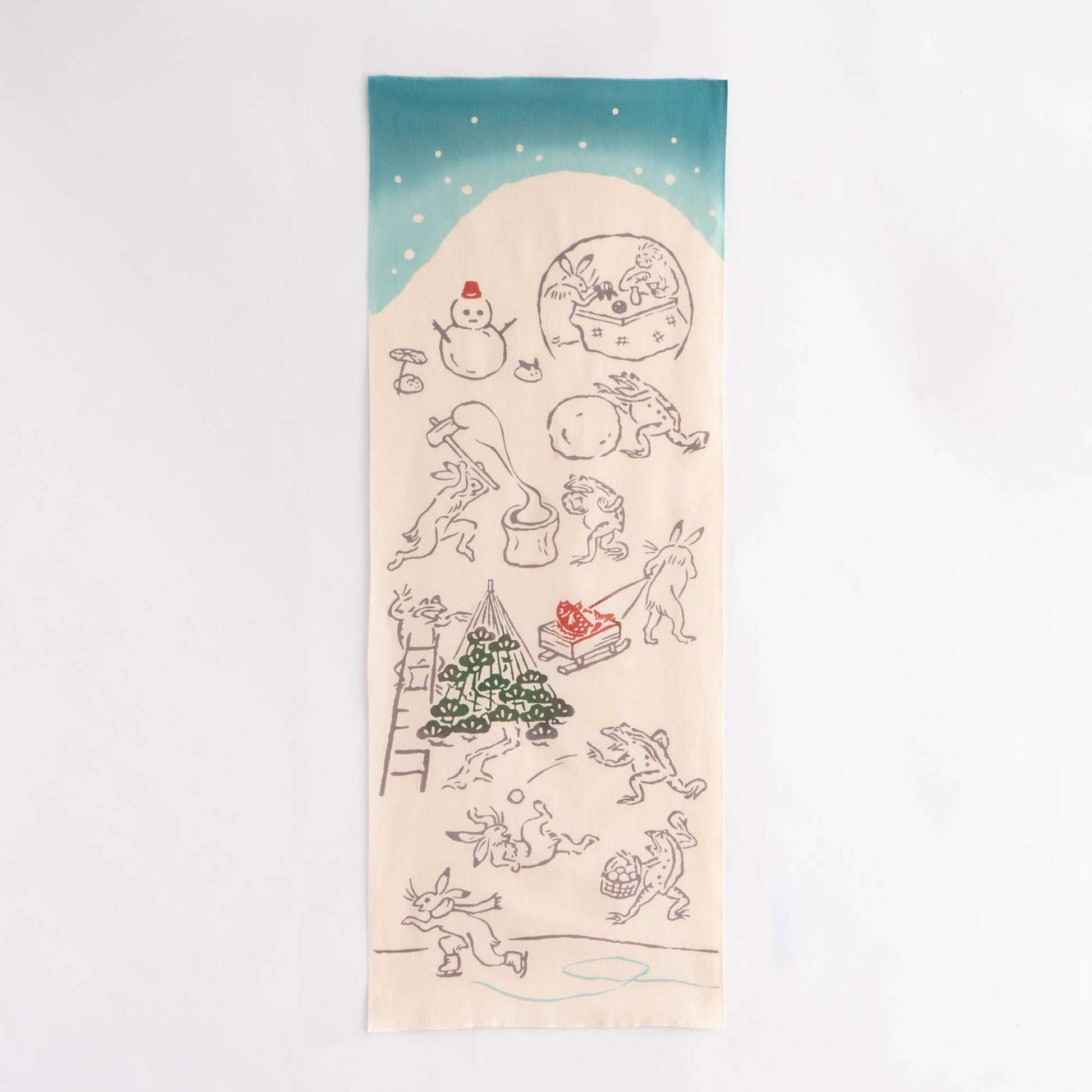 Before the full chill of winter arrives, this tenugui brings to life traditional Japanese winter scenes featuring the playful rabbits and frogs of the Choju-Giga (Scrolls of Frolicking Animals). It depicts preparations for winter, such as yukitsuri — the traditional method of supporting tree branches with ropes to protect them from heavy snow — and rice-cake pounding, as well as activities like skating and snow play.